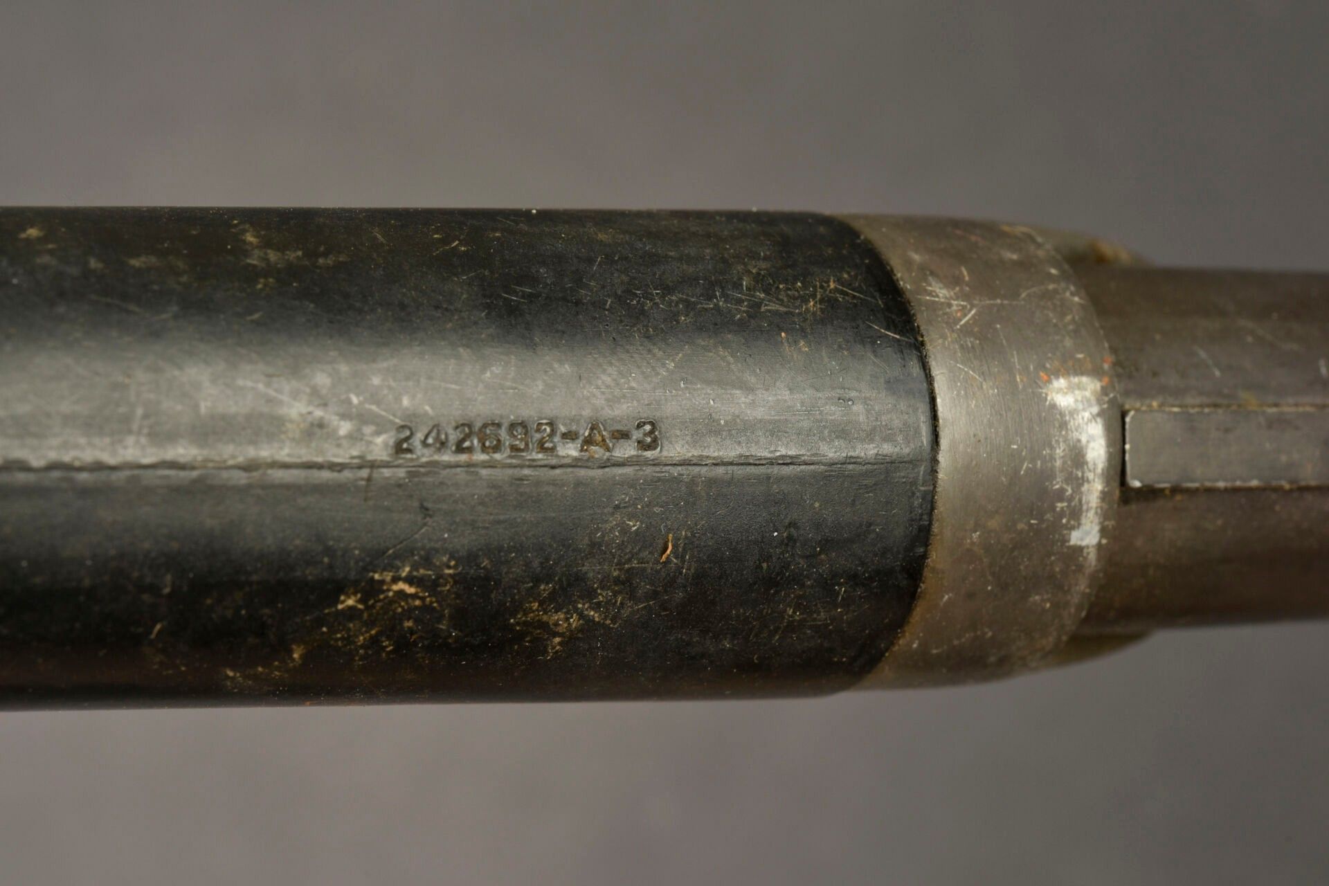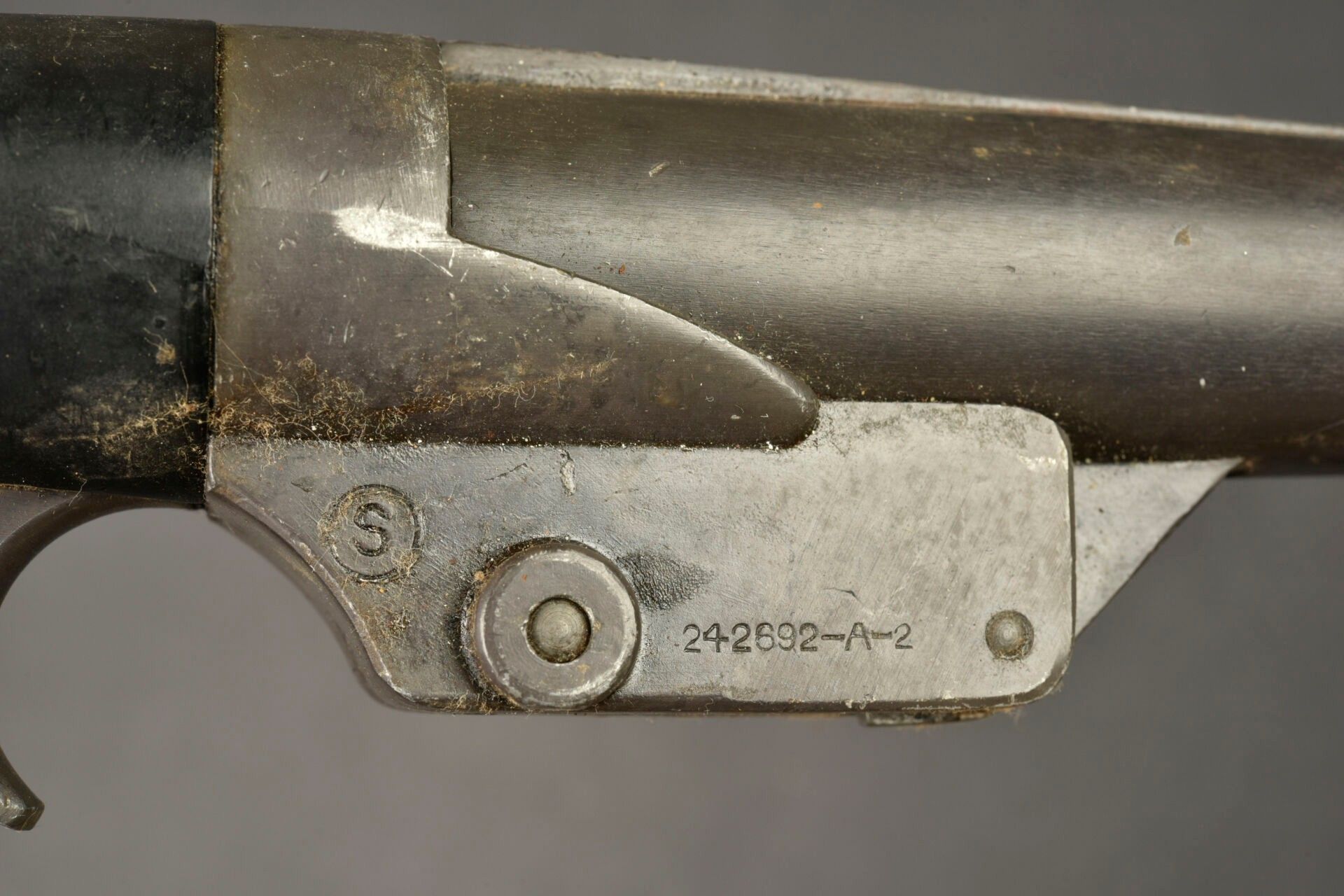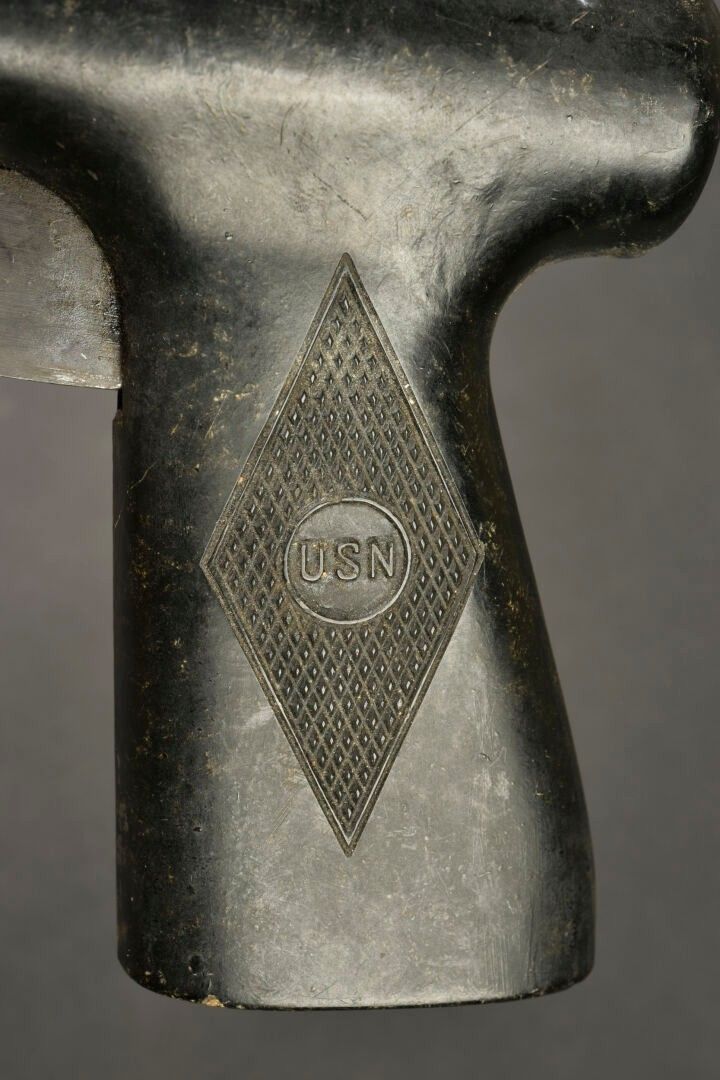 US Navy Sedgley Mark 5 rocket pistol. One-piece plastic grip with checkered lozenges marked USN. Bronze plated steel barrel. Marked on top SIGNAL PISTOL MARK 5 R.F. SEDGLEY INC. 1942. Functional mechanism. Wear, patina II. Weapon of category D under condition of an identity paper reserved to the major.