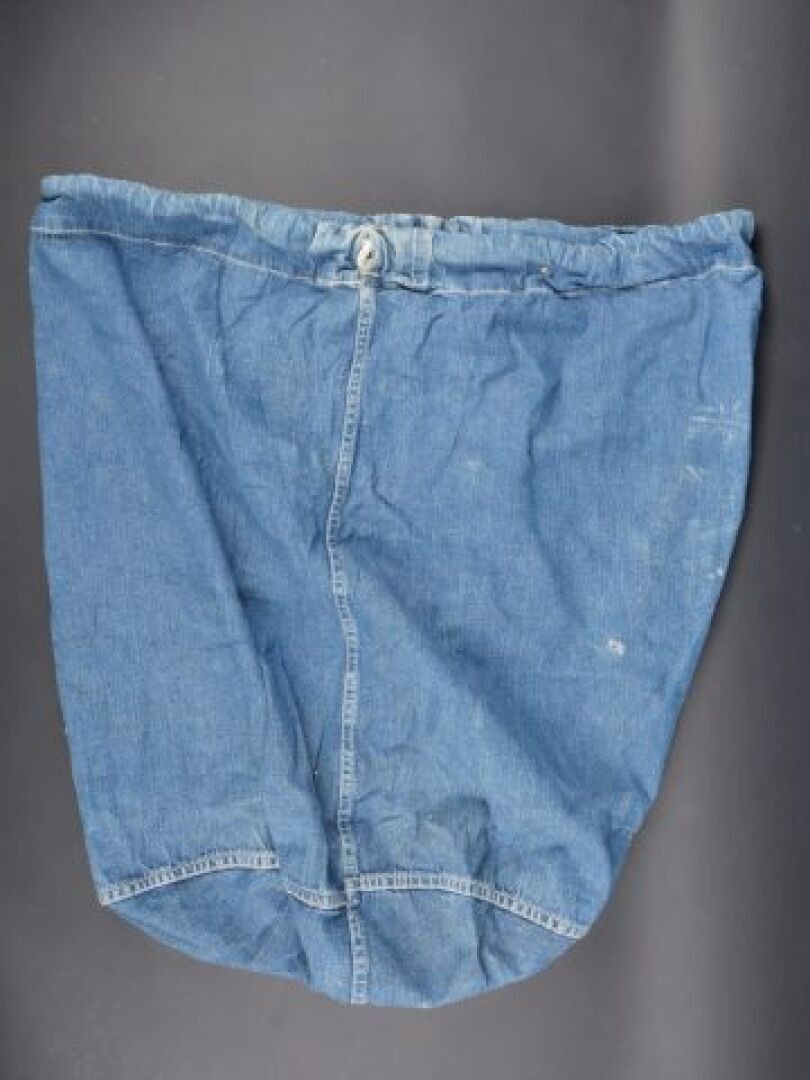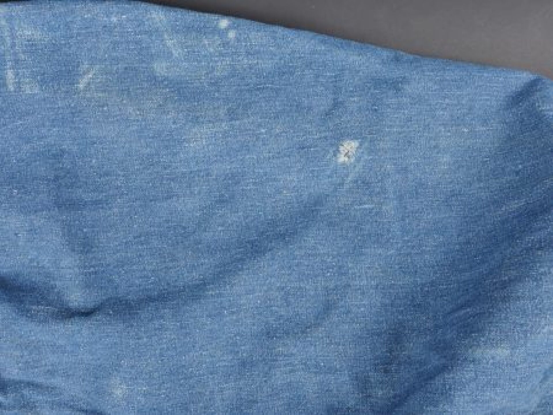 Denim shopping bag. Strong blue denim canvas bag. The drawstring is present. No visible markings. Some wear and patina to parts, as well as a few stains and tears. Condition II+. 2+