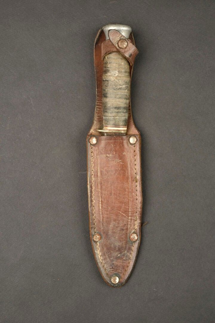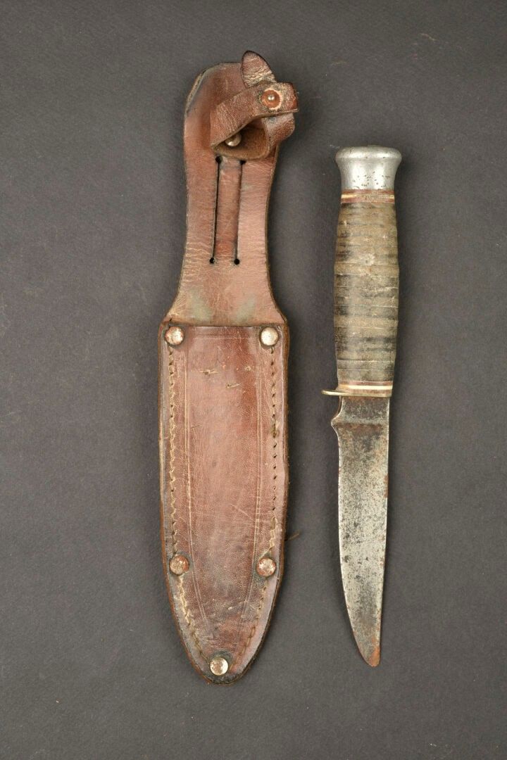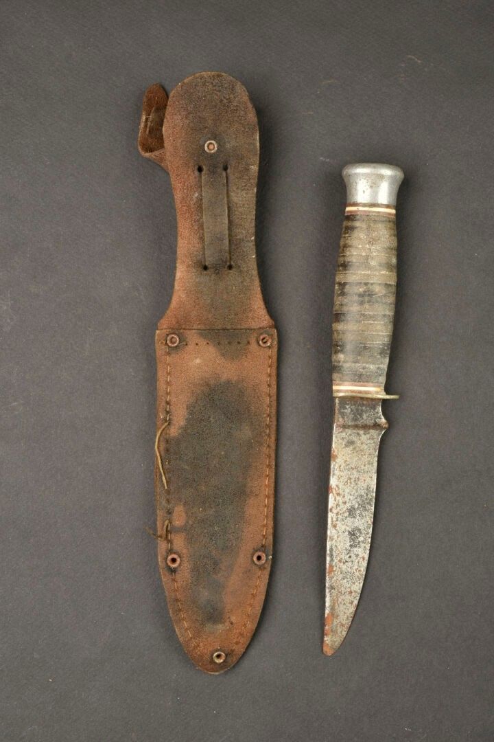USN knife. Metal fittings. Handle with leather rings. Blade heavily sharpened and oxidised. Markings illegible. Brown leather sheath with functional snap. Some wear and patina. Condition II+. For adults only.