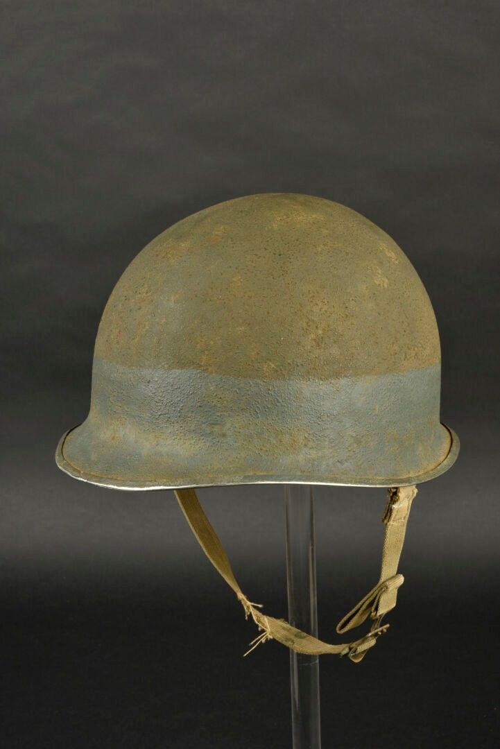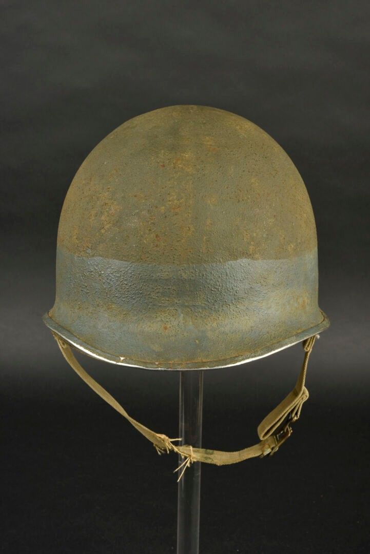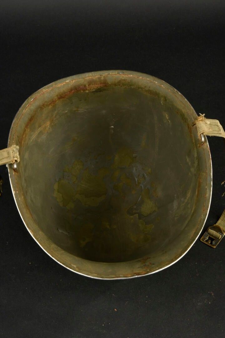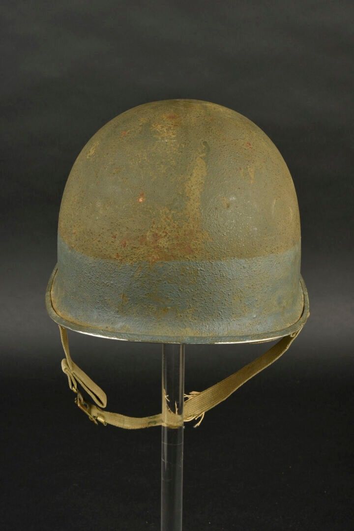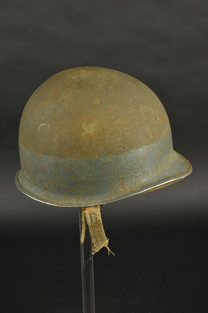 US Navy helmet. USM1 helmet shell, lot number illegible. Interior of the shell with several coats of khaki paint. Exterior paintwork 80% complete. Blue stripe around the shell. Fixed bridges. Chinstraps are present, but stitched. The large chinstrap is frayed. High-pressure composite liner, made by Capac. Headgear complete with leather sweatband. Nape of the neck complete. Leather chinstrap missing. Exterior paintwork 95% grained. Some wear and patina to be noted. Condition II+. 2+
