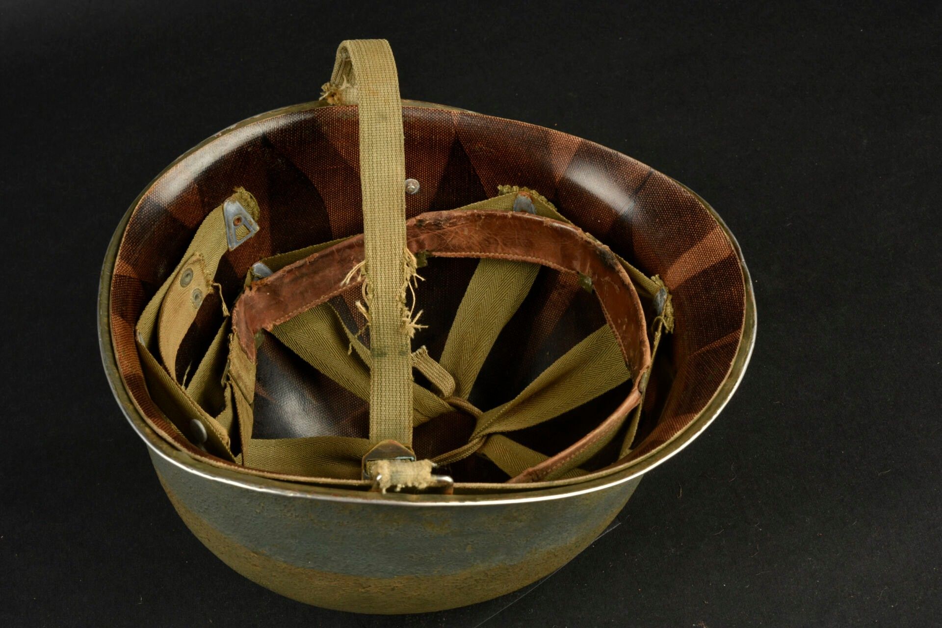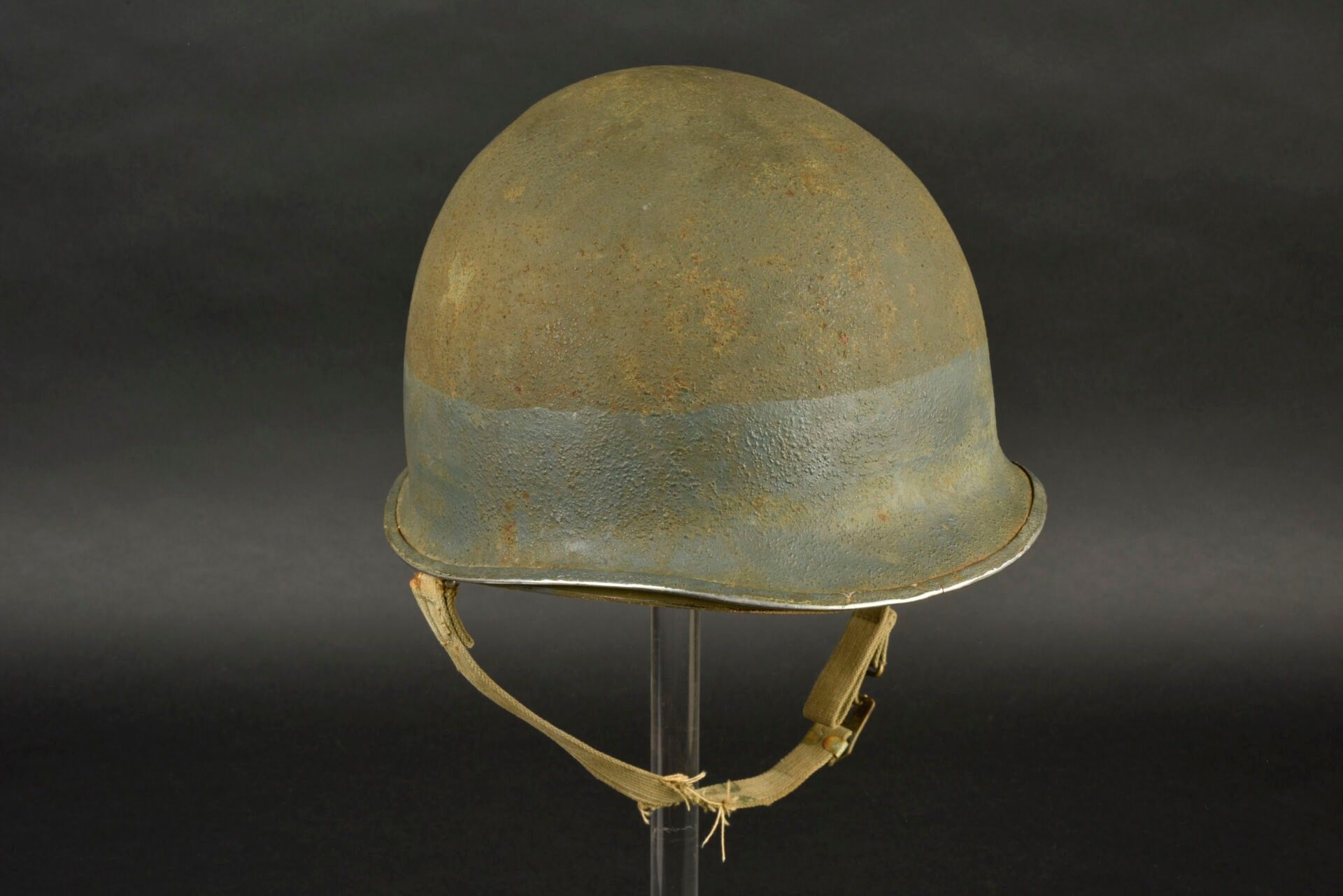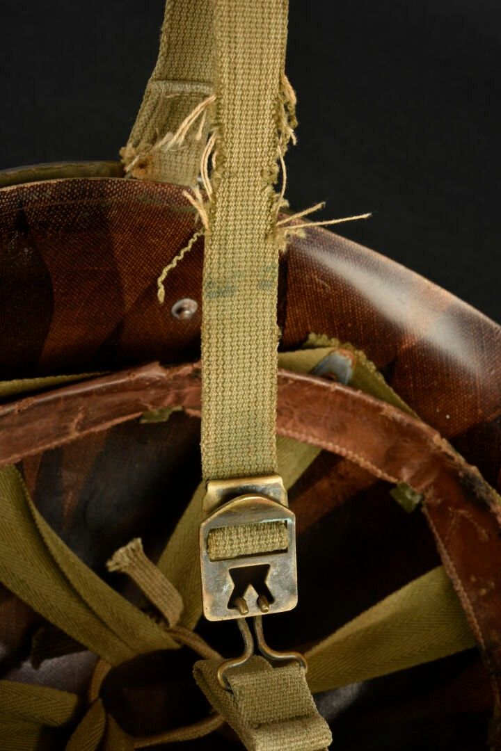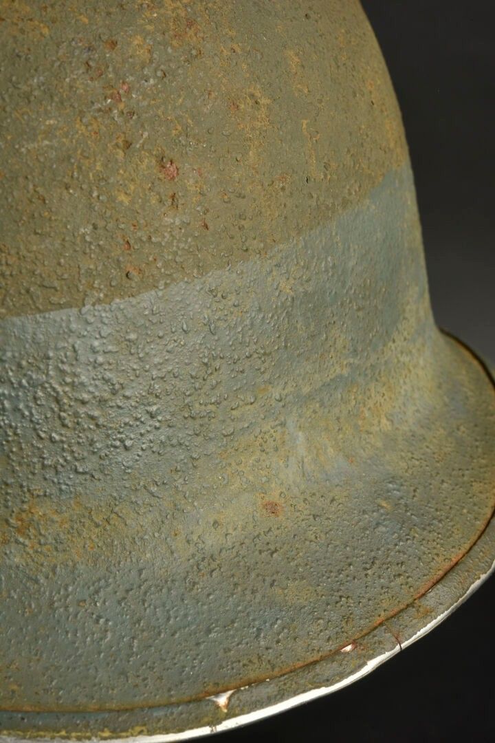 US Navy helmet. USM1 helmet shell, lot number illegible. Interior of the shell with several coats of khaki paint. Exterior paintwork 80% complete. Blue stripe around the shell. Fixed bridges. Chinstraps are present, but stitched. The large chinstrap is frayed. High-pressure composite liner, made by Capac. Headgear complete with leather sweatband. Nape of the neck complete. Leather chinstrap missing. Exterior paintwork 95% grained. Some wear and patina to be noted. Condition II+. 2+