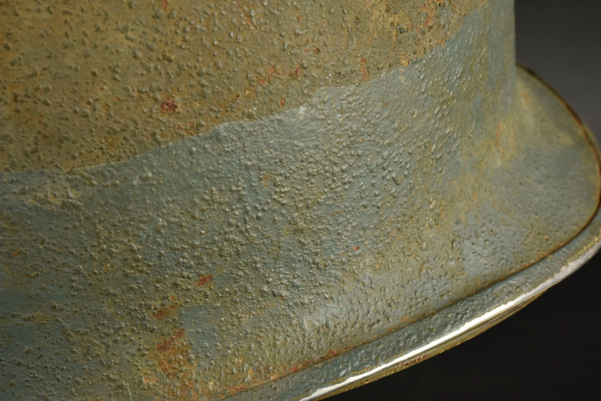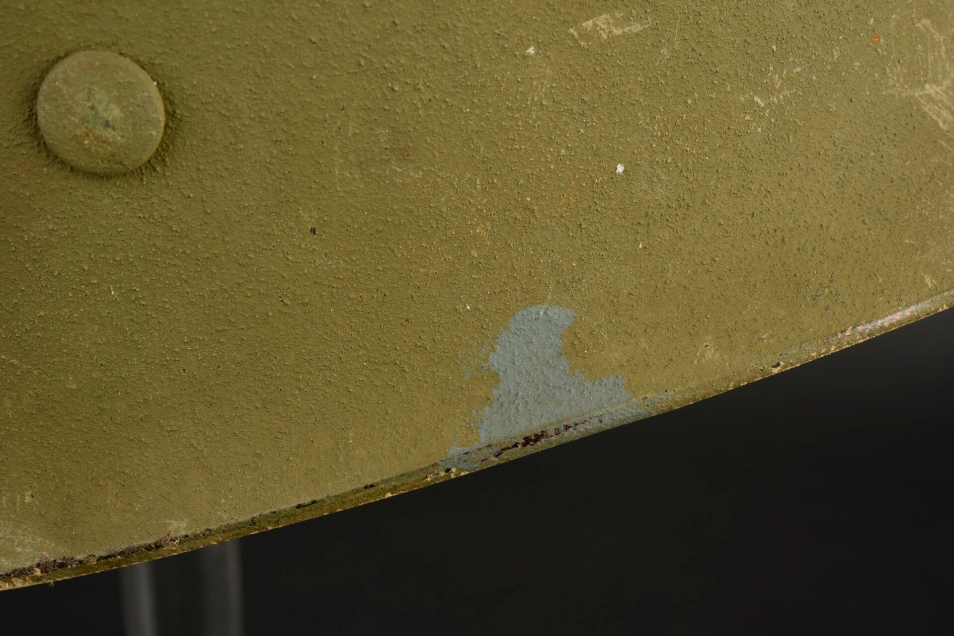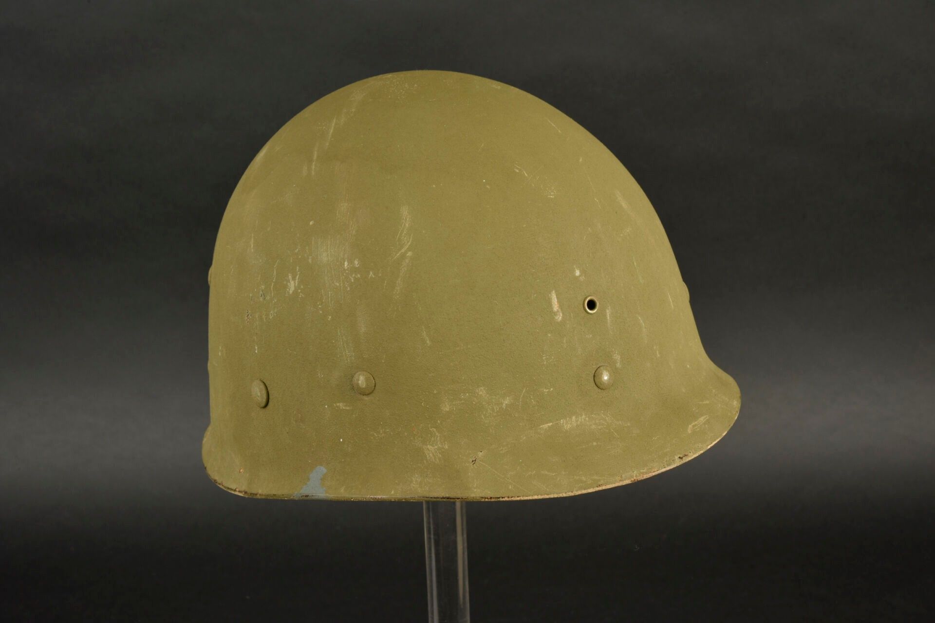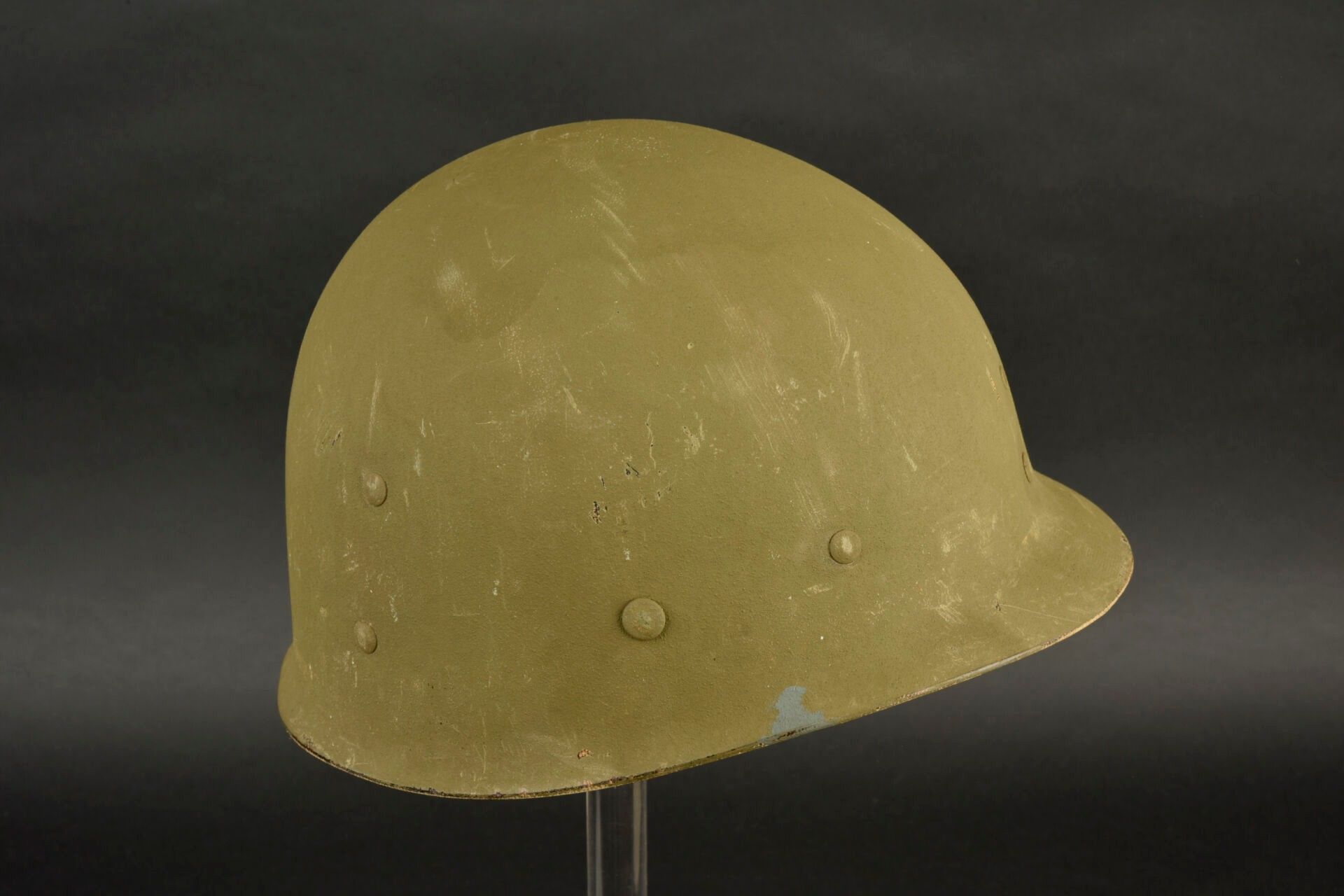 US Navy helmet. USM1 helmet shell, lot number illegible. Interior of the shell with several coats of khaki paint. Exterior paintwork 80% complete. Blue stripe around the shell. Fixed bridges. Chinstraps are present, but stitched. The large chinstrap is frayed. High-pressure composite liner, made by Capac. Headgear complete with leather sweatband. Nape of the neck complete. Leather chinstrap missing. Exterior paintwork 95% grained. Some wear and patina to be noted. Condition II+. 2+