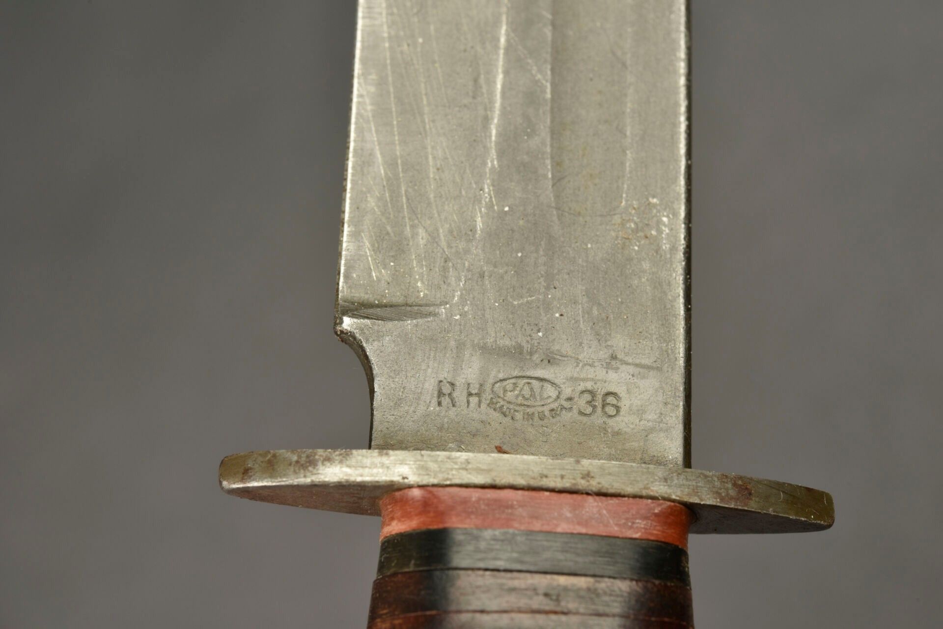 RH 36 knife. Metal pommel. Handle with leather rings. Very beautiful blade in its original colour (95%). RH 36 markings, PAL manufacture. Brown leather scabbard with functional snap. Remains of engraved nameplate E. Some wear and patina. Condition II+. For adults only.