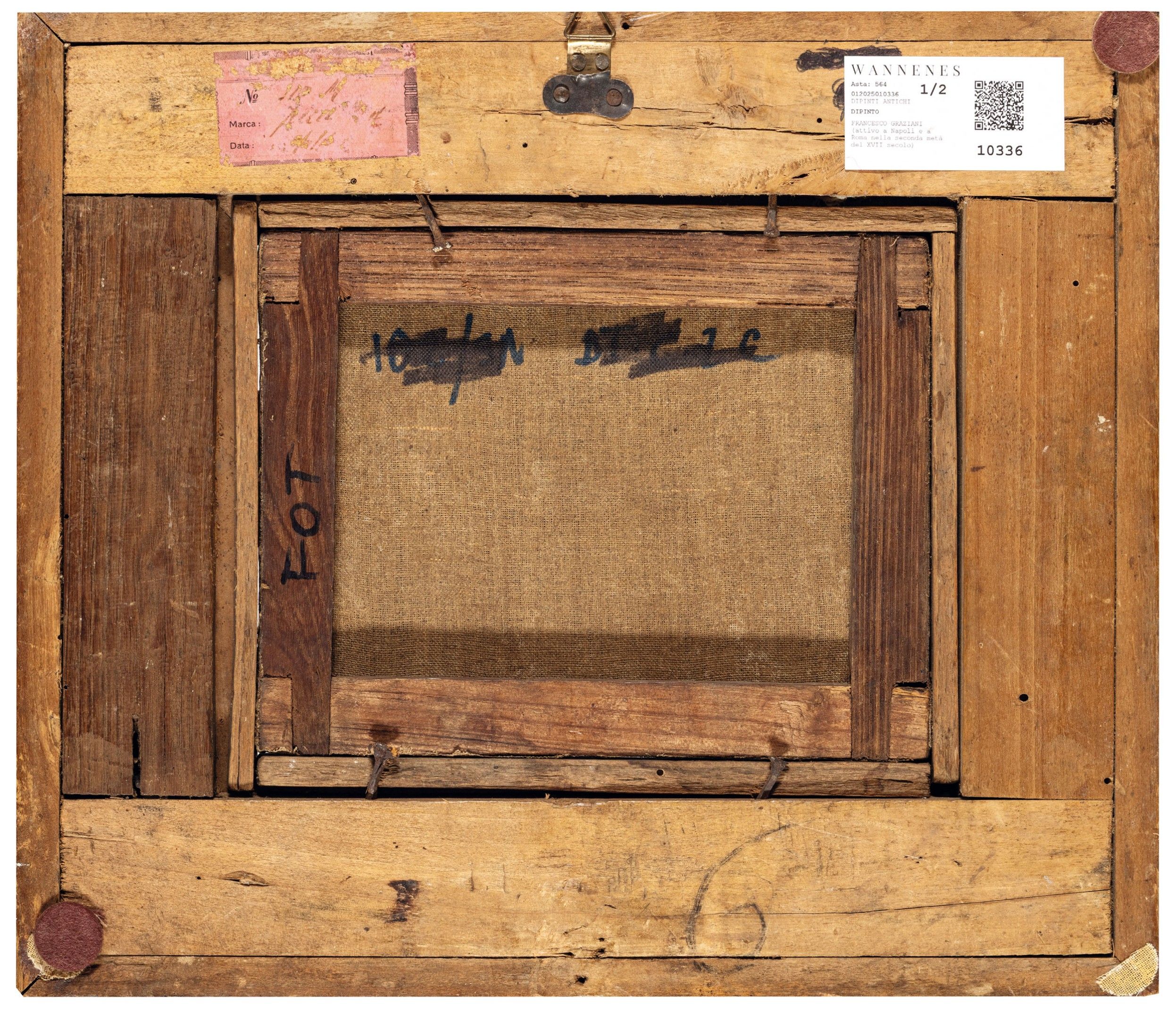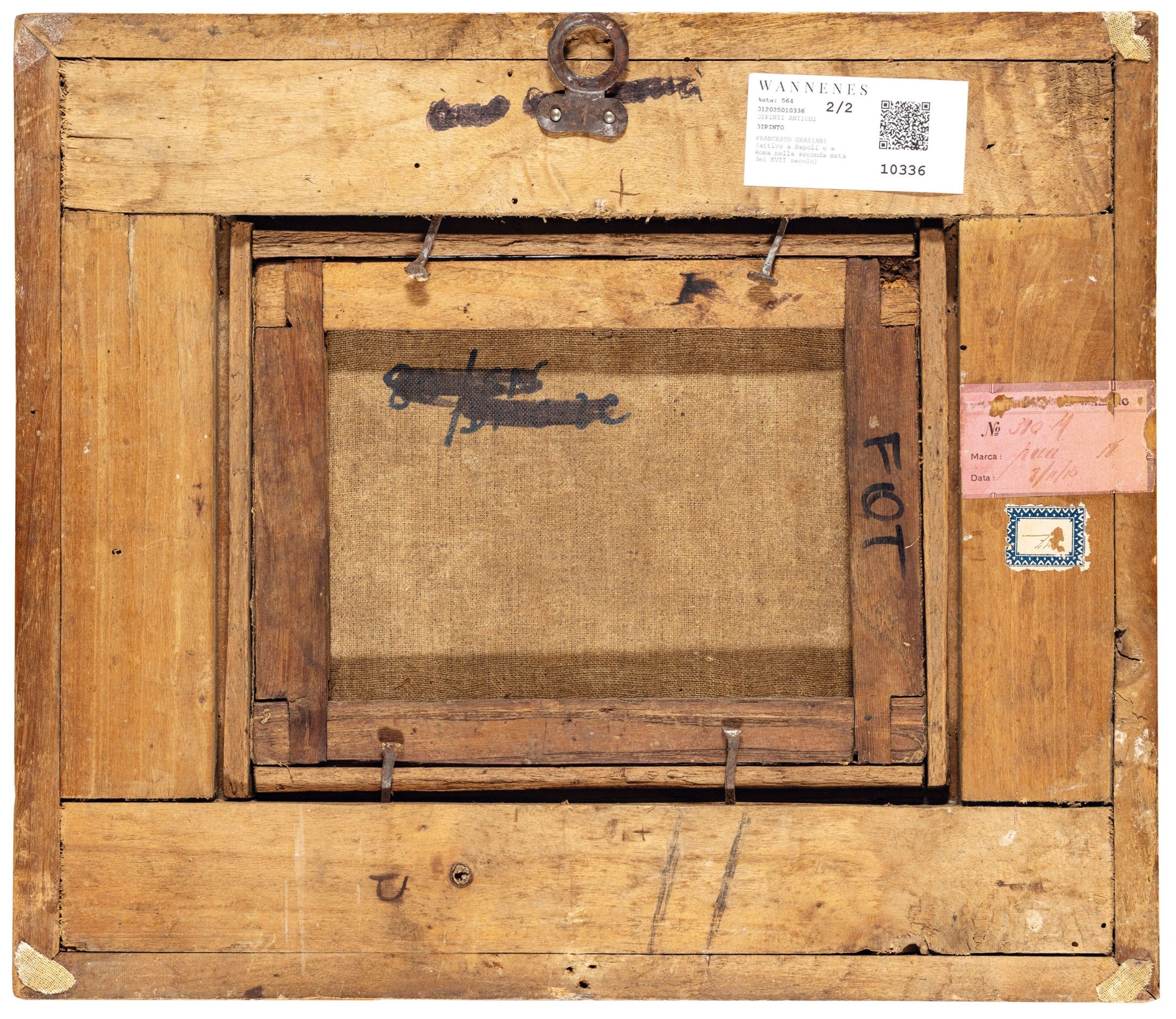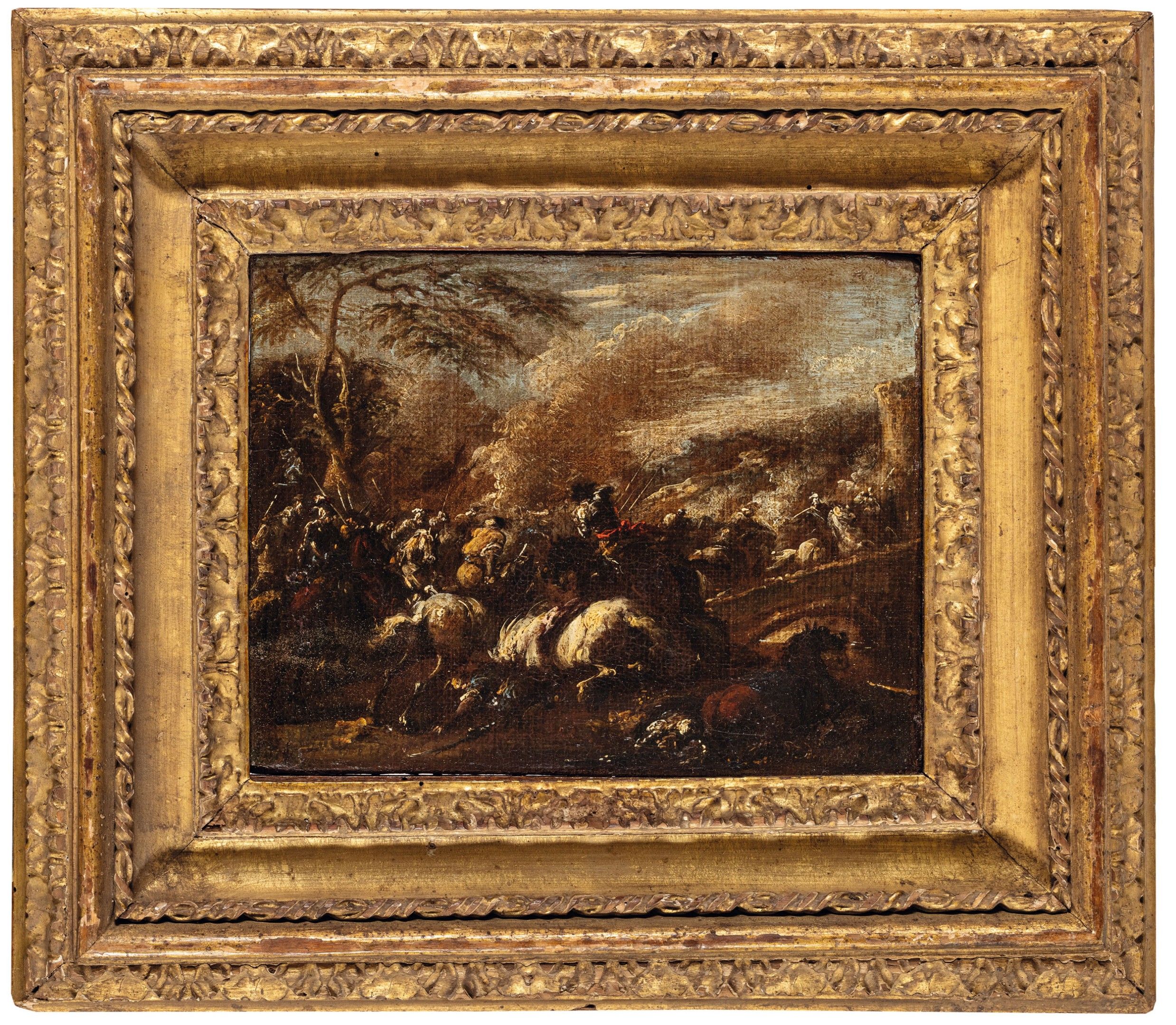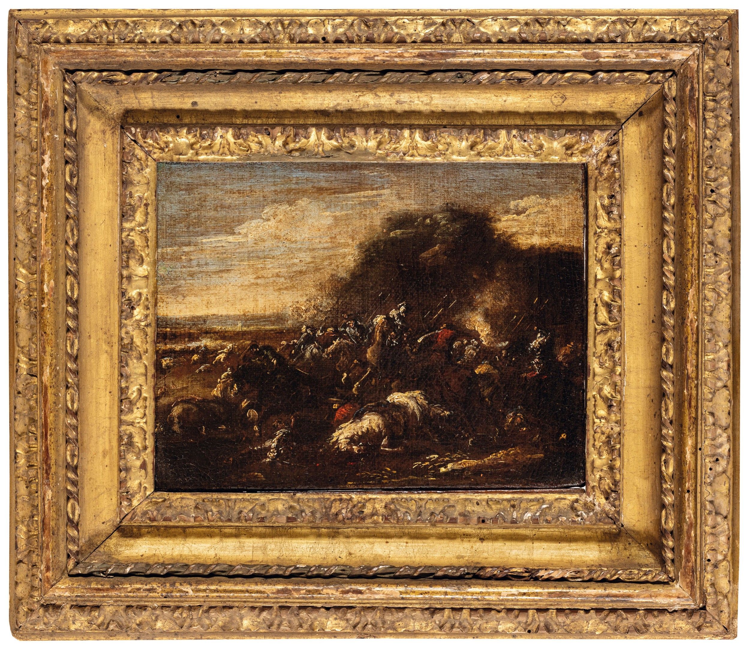 Introduced by Salvator Rosa frames with three rows of carvings, the paintings are exemplary for understanding the style and quality of Francesco Graziani; an artist whose fame is linked to this peculiar pictorial genre, as the ancient inventories of Roman collections from the Baroque period show. For example, the description of the Barberini picture gallery compiled in 1686 mentions several of the painter's battles and seascapes that are no longer identifiable, and the famous Pallavicini Gallery, whose catalogue is the work of Federico Zeri, also records works of his that are considered fundamental and reveal a figurative culture between Courtois and Salvator Rosa. Even in the absence of a catalogue raisonné, Graziani's production reveals a remarkable talent, characterised by drafts with fractured and curled manners, capable of evoking with surprising effectiveness the agitated movement and narrative of war scenes. Therefore, one must recognise the author's autonomy of intent with respect to the artists mentioned above. In fact, as is evident from the canvases under examination, Graziani masterfully combines, in tune with Baroque flair, the taste for sketch-like execution with the descriptive needs of a war event, and it is sufficient to observe how the rapidity of the brushstrokes does not detract from the objectivity of the images and the atmospheric setting. Observe, for example, the skilful use of the brown preparation that blends with the smoke and dust, just as the depth of the landscape is perfectly evoked by thin lines of white lead that delineate the scenic planes in which buildings and horsemen are outlined with brushstrokes. As a result, Graziani must be acknowledged as playing a far from secondary role in the Capitoline art scene, to the detriment of those critics who stubbornly distinguish the value of artists according to genres, putting their painting skills in second place.