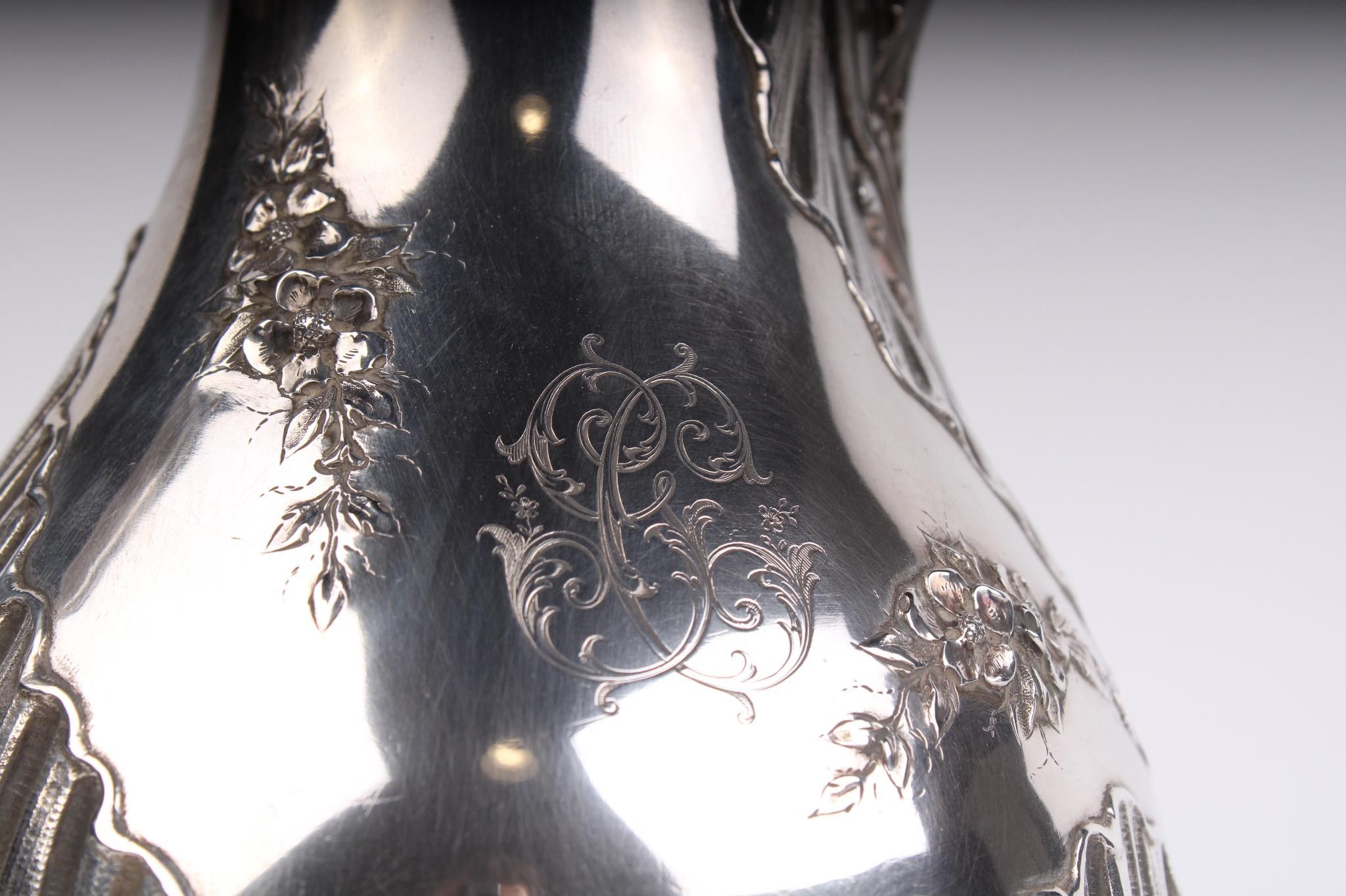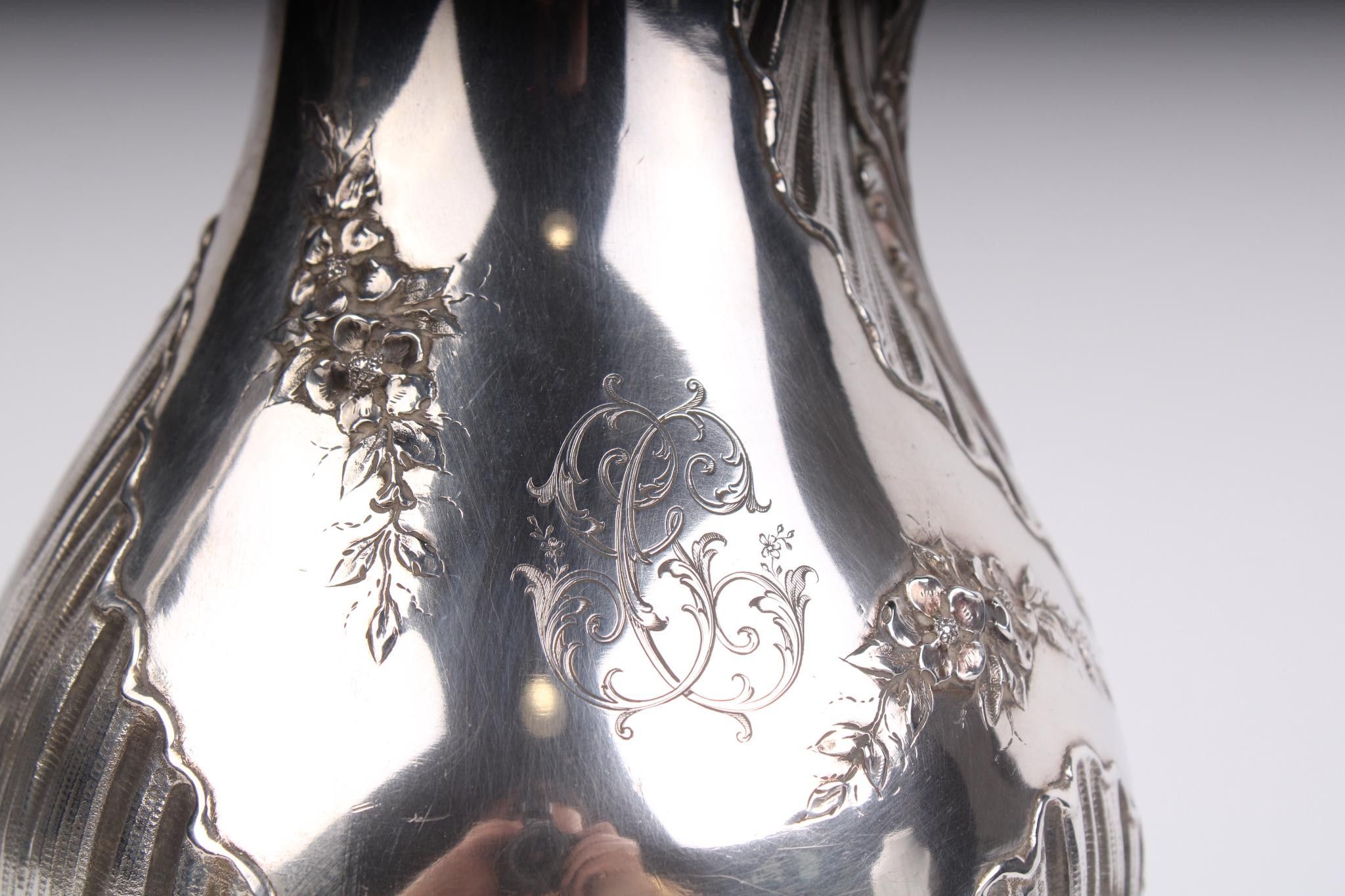 The spout is underlined by a leafy cartouche, the body decorated with flowering branches in relief and engraved with a monogram.