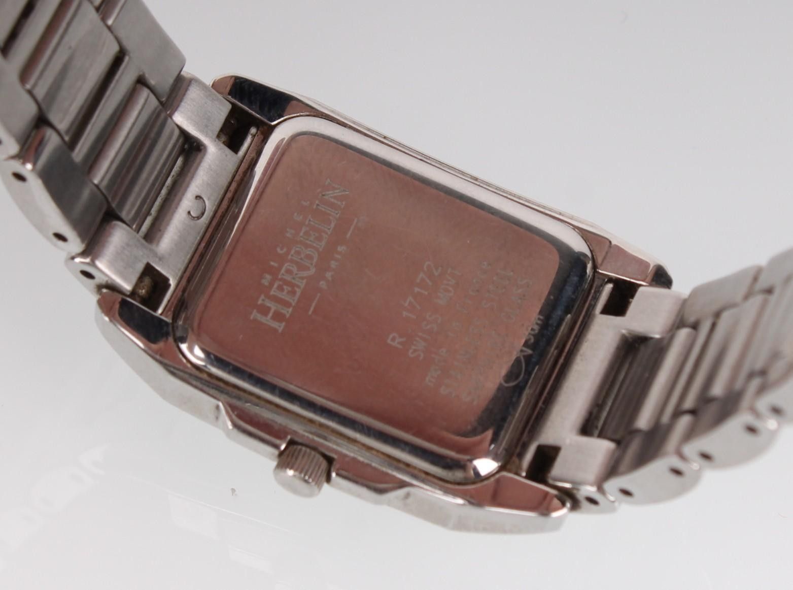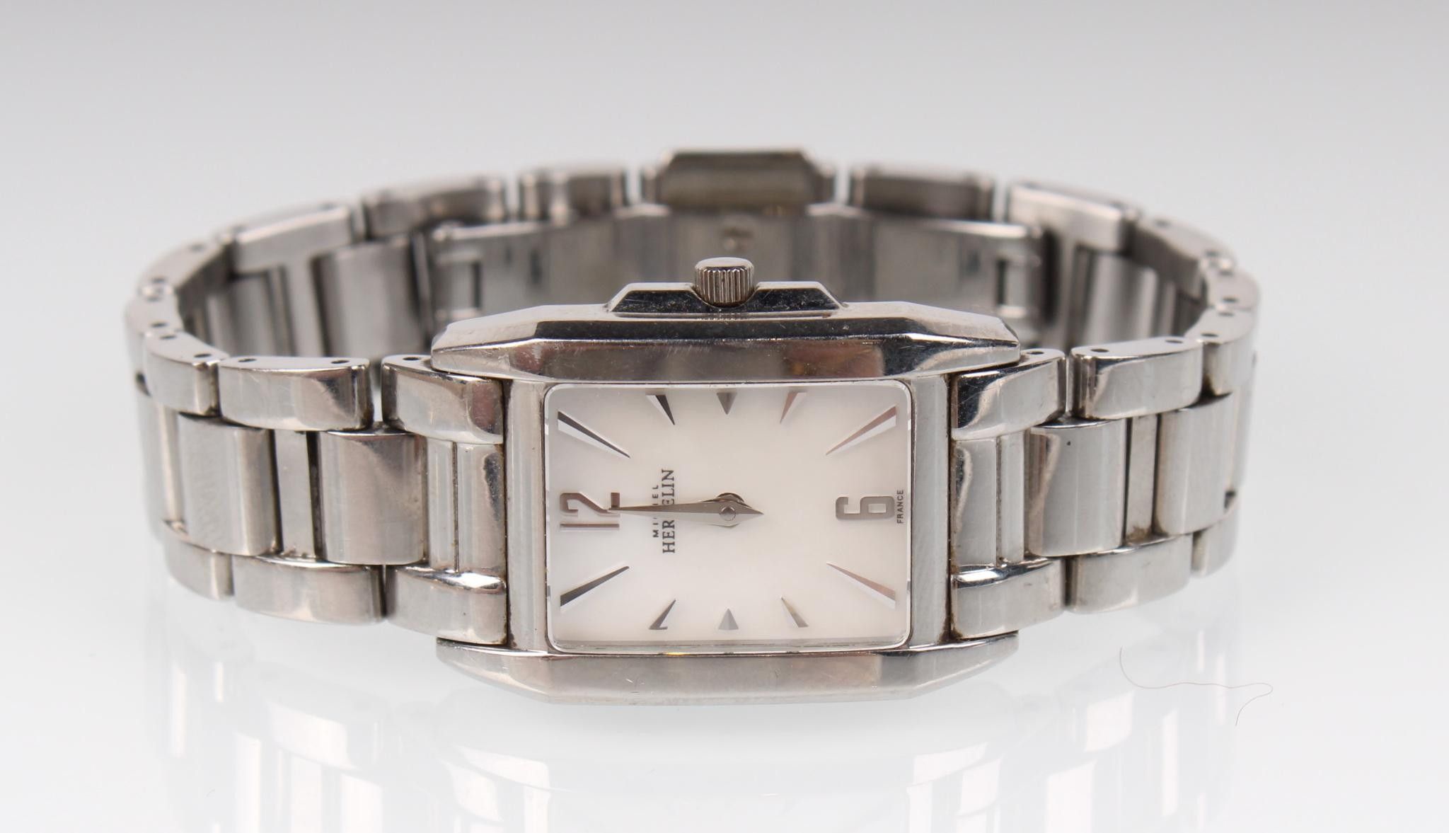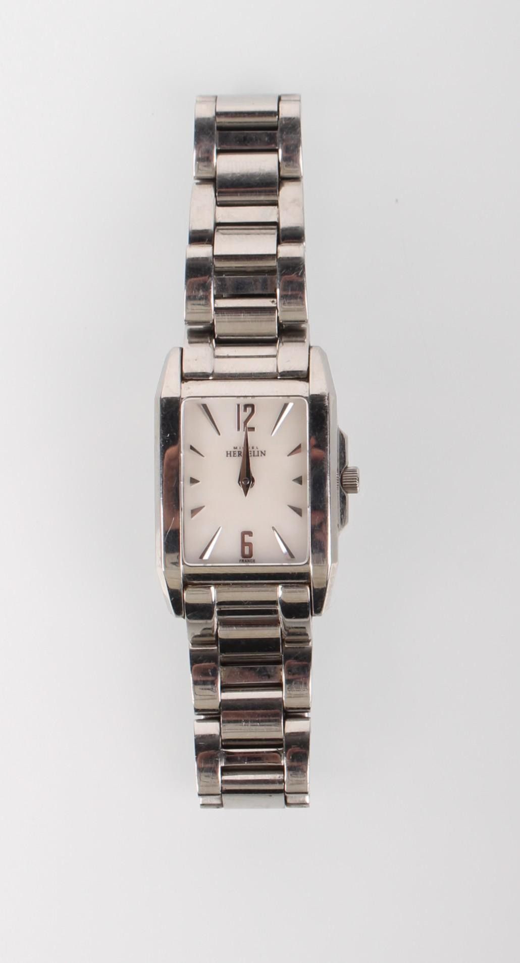 In steel, the rectangular dial has a mother-of-pearl background. Mesh bridge bracelet. Folding clasp.