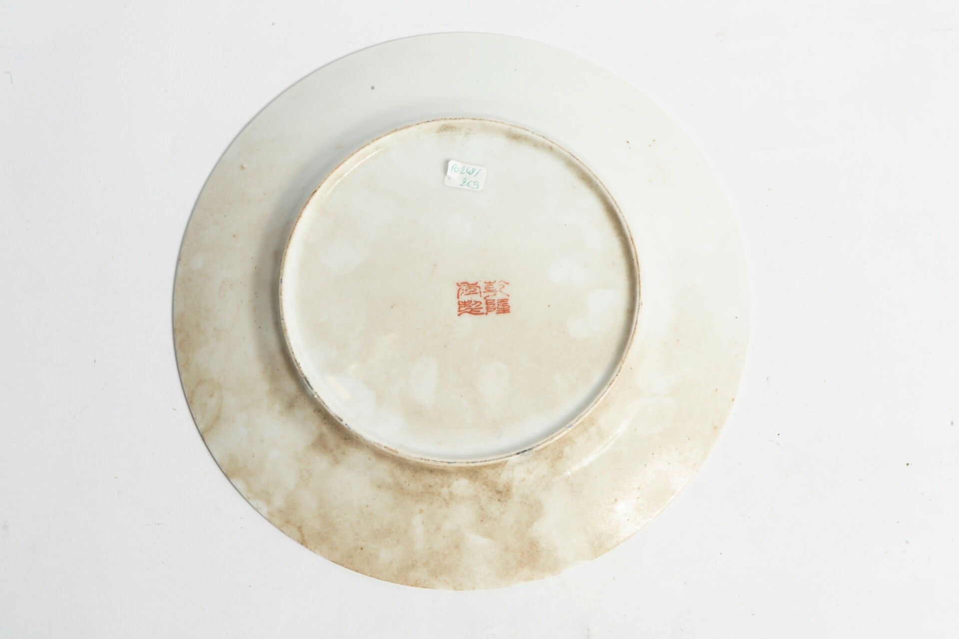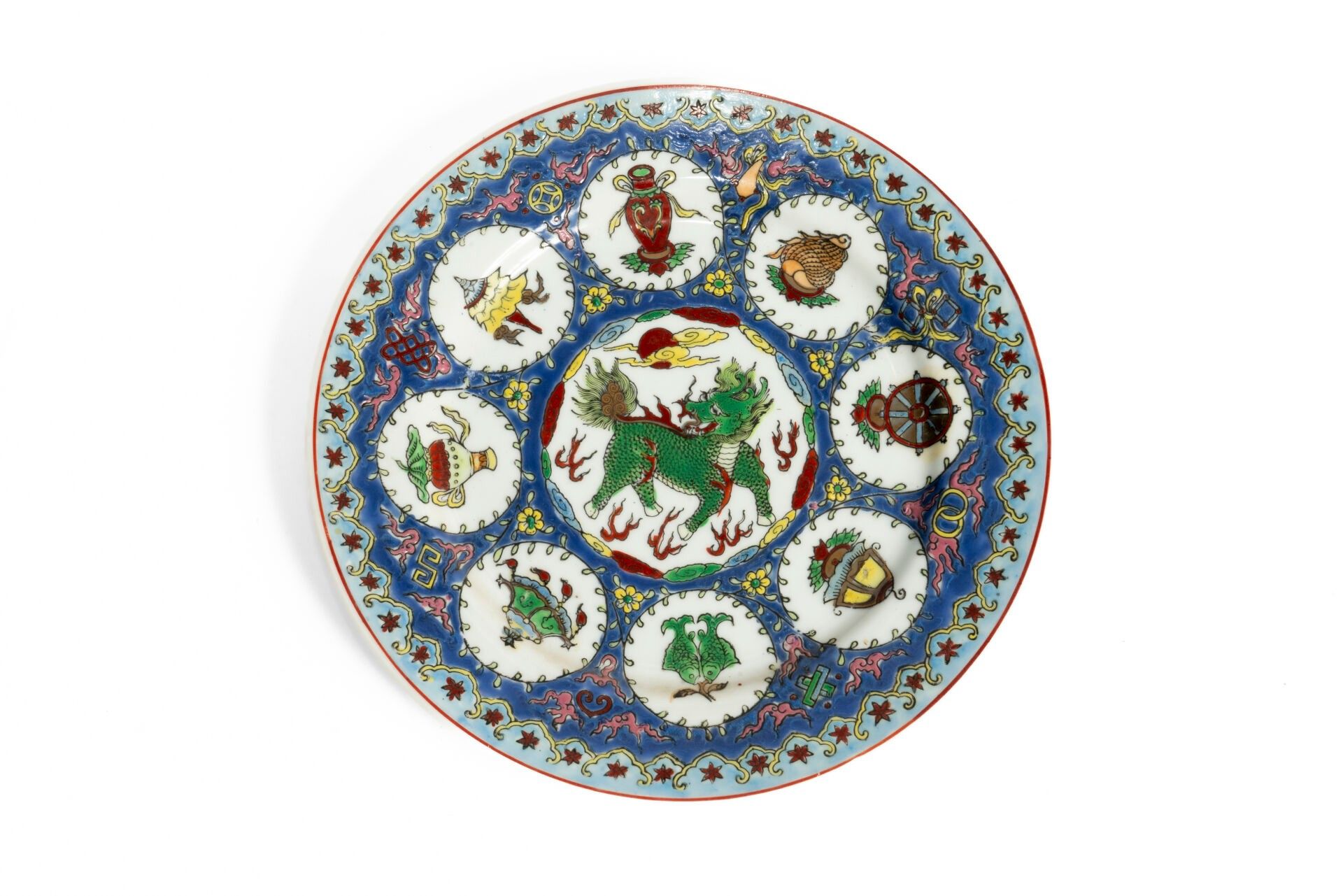 CHINA. Porcelain and enamel dish decorated with eight Buddhist emblems. D_ 26 cm Wear and tear.