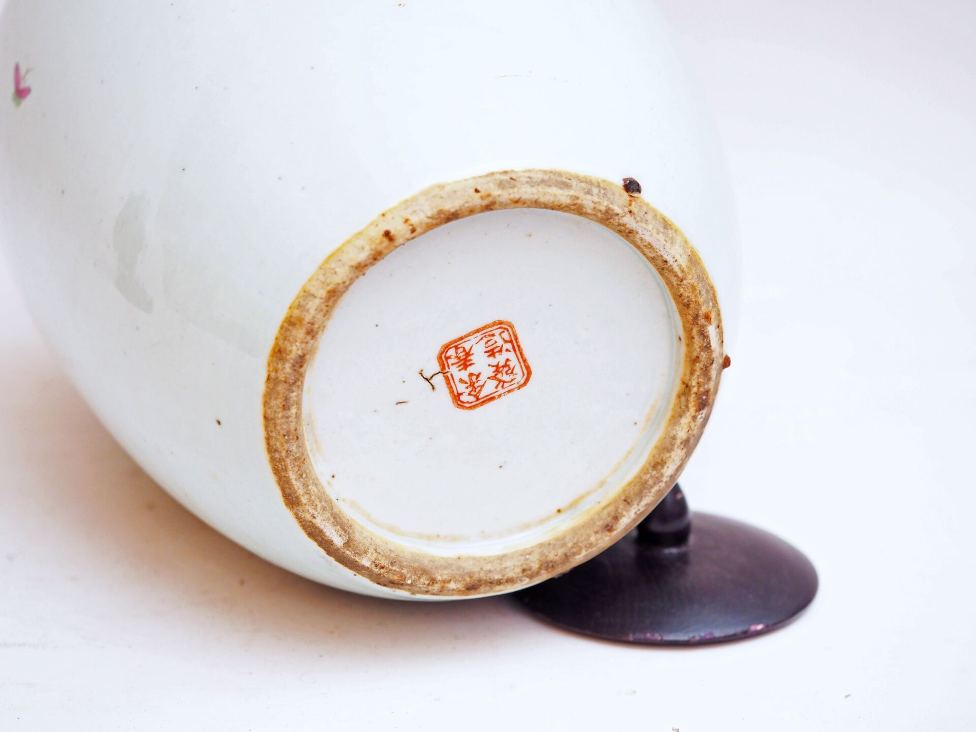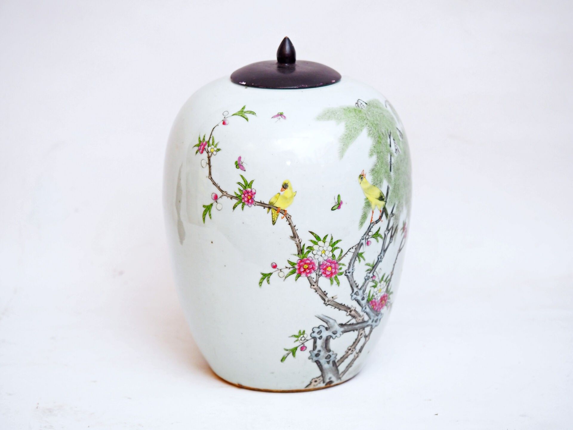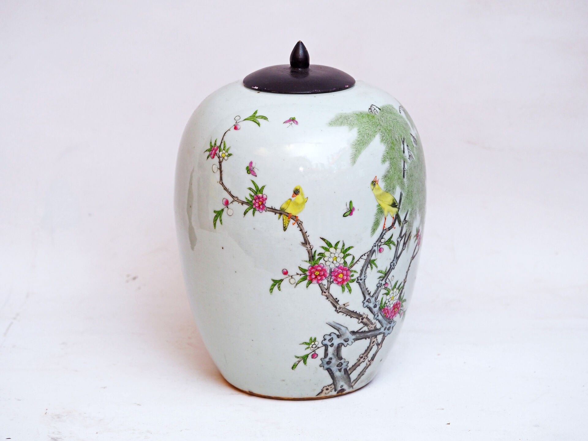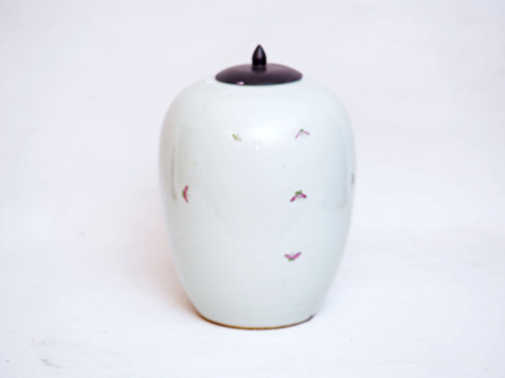 Porcelain and polychrome enamel ovoid ginger pot decorated with birds, flowers and butterflies.
