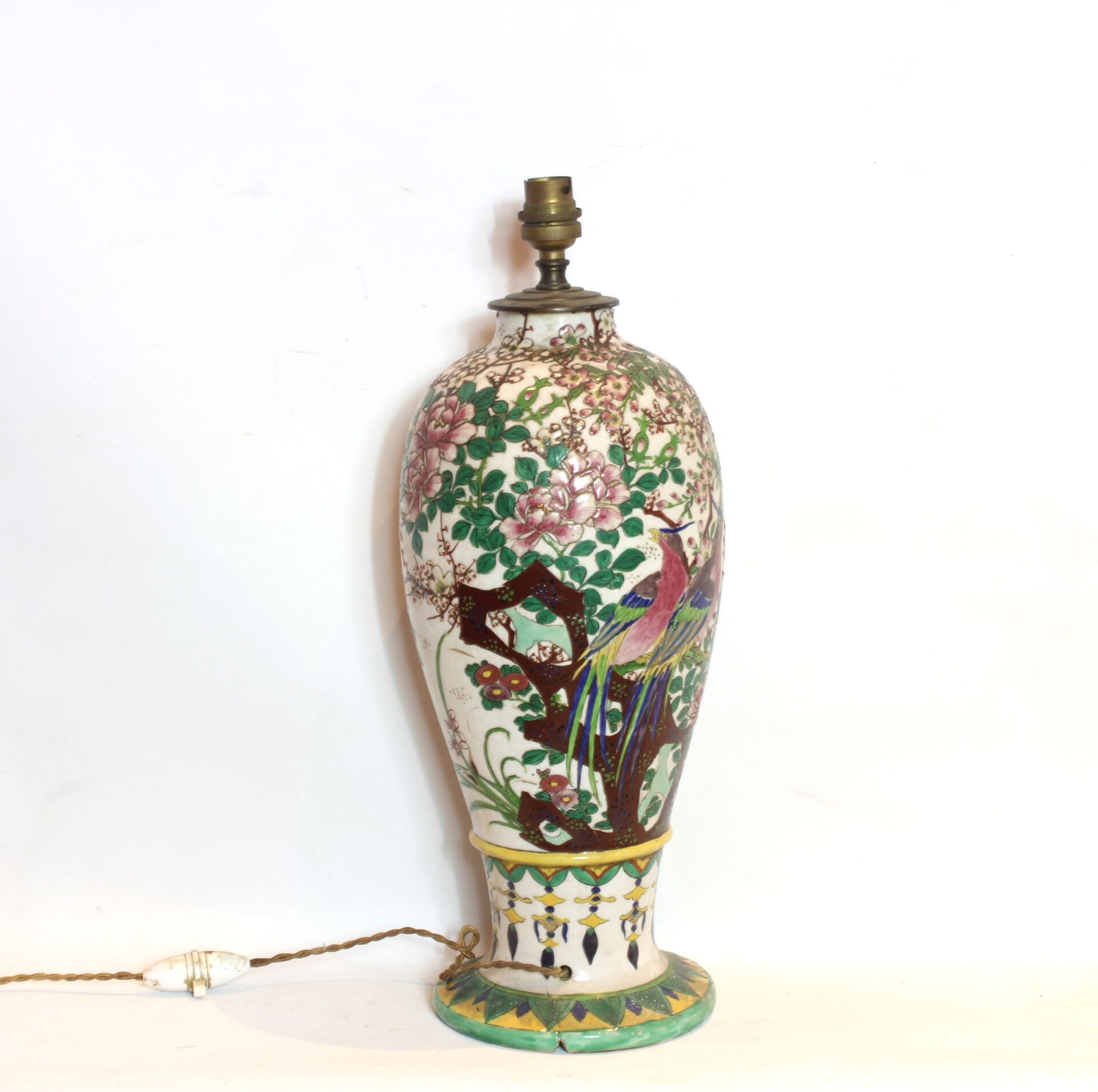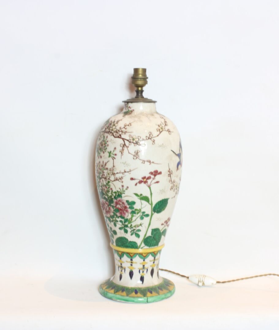 Enamelled porcelain lamp vase decorated with leaves and birds