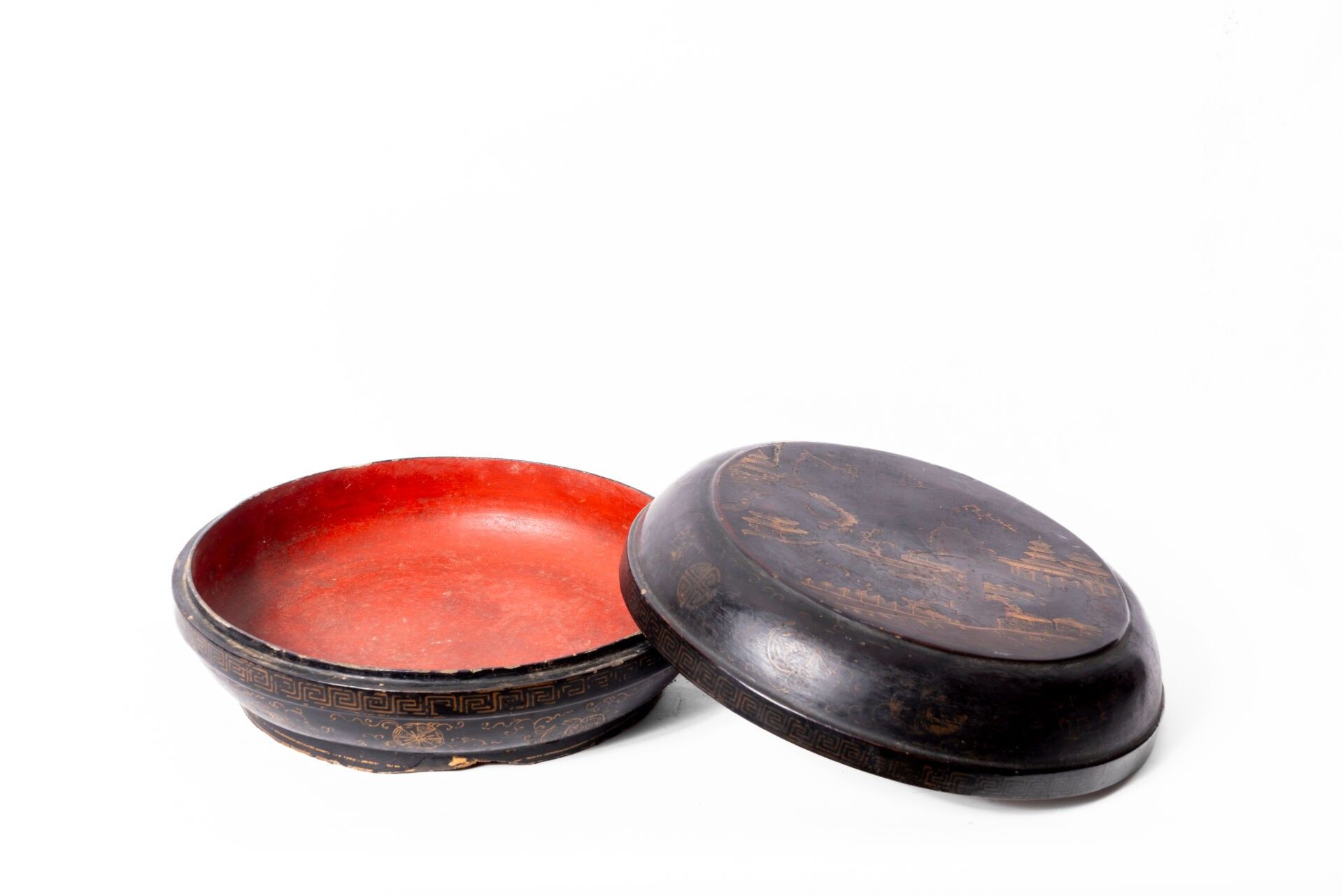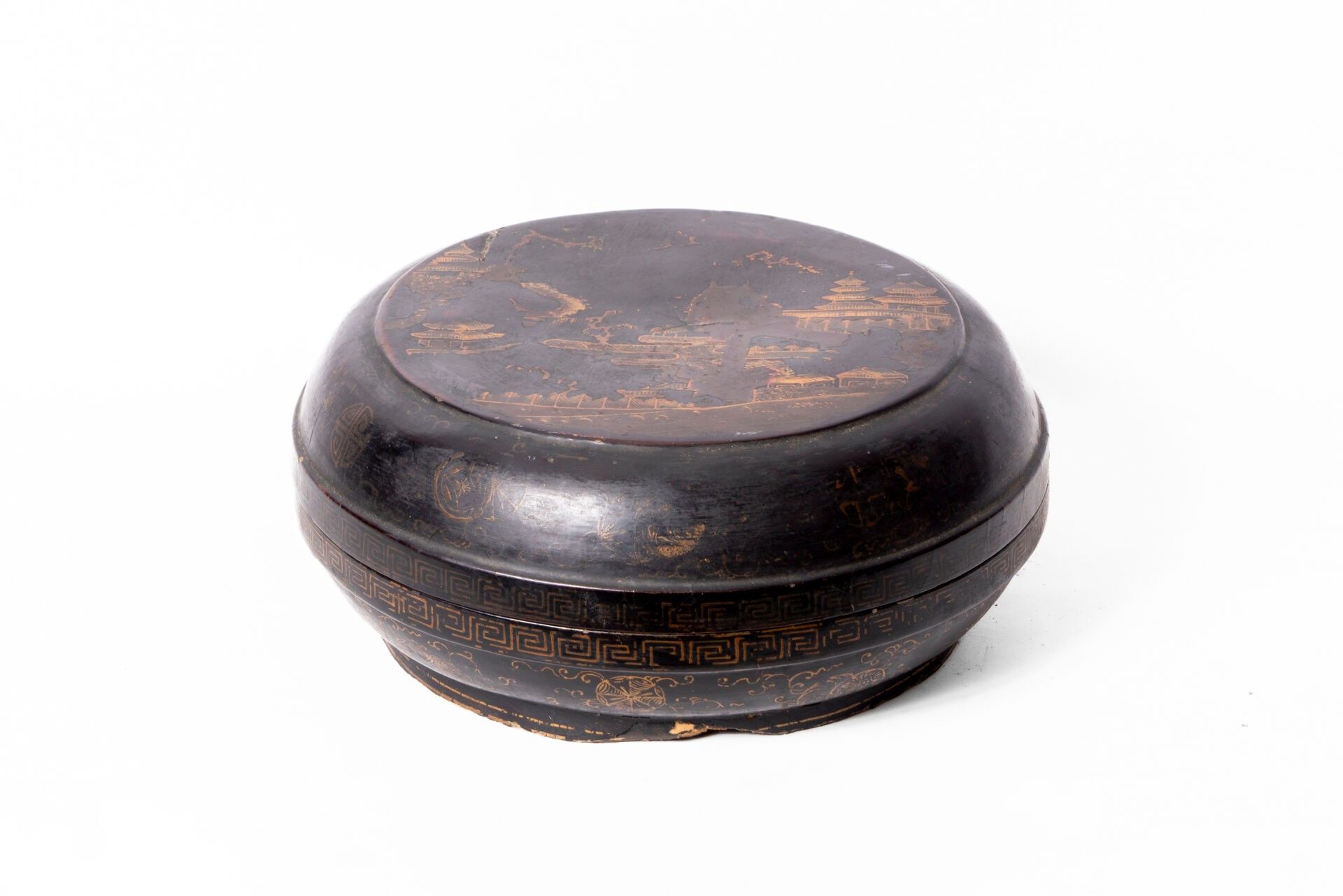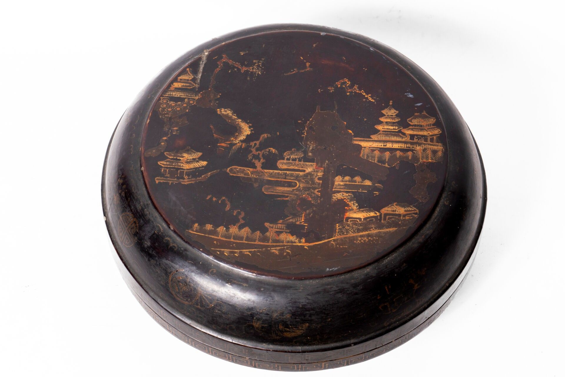 CHINA. Lacquered wood lenticular box with pagoda decoration.