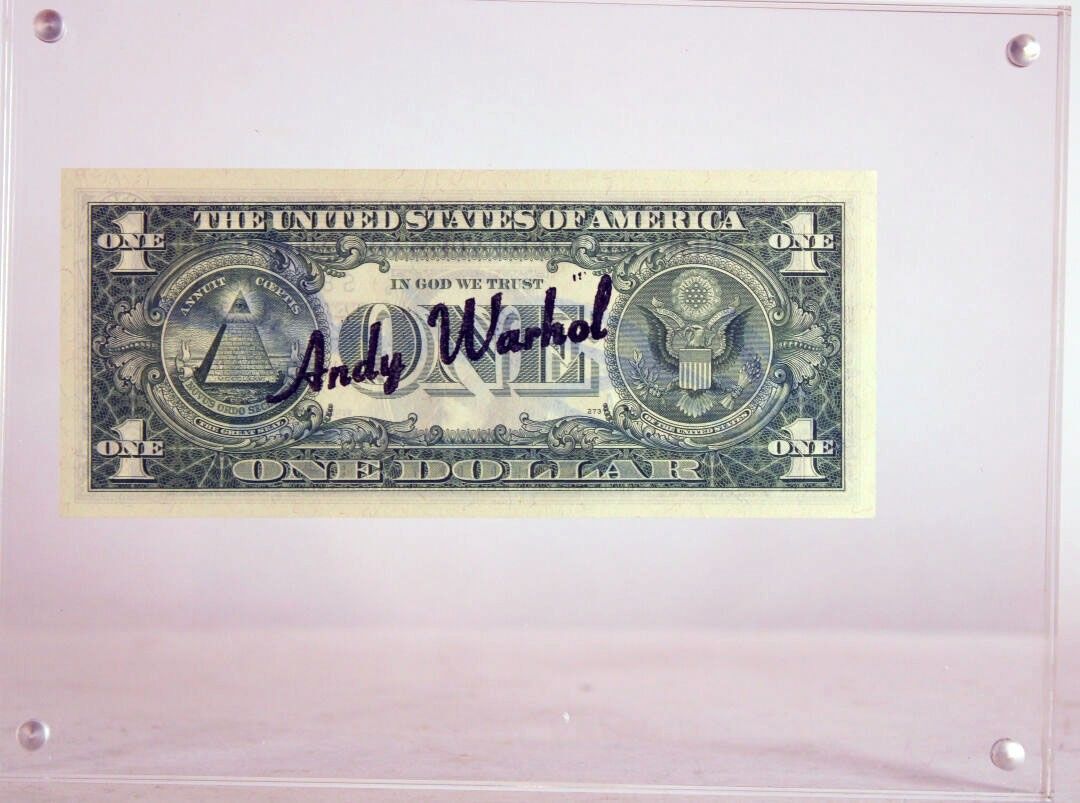Attributed to Andy WARHOL. Attributed to Andy WARHOL (1928-1987). George Washington" one-dollar note signed in blue felt pen. Framed in plexiglas.