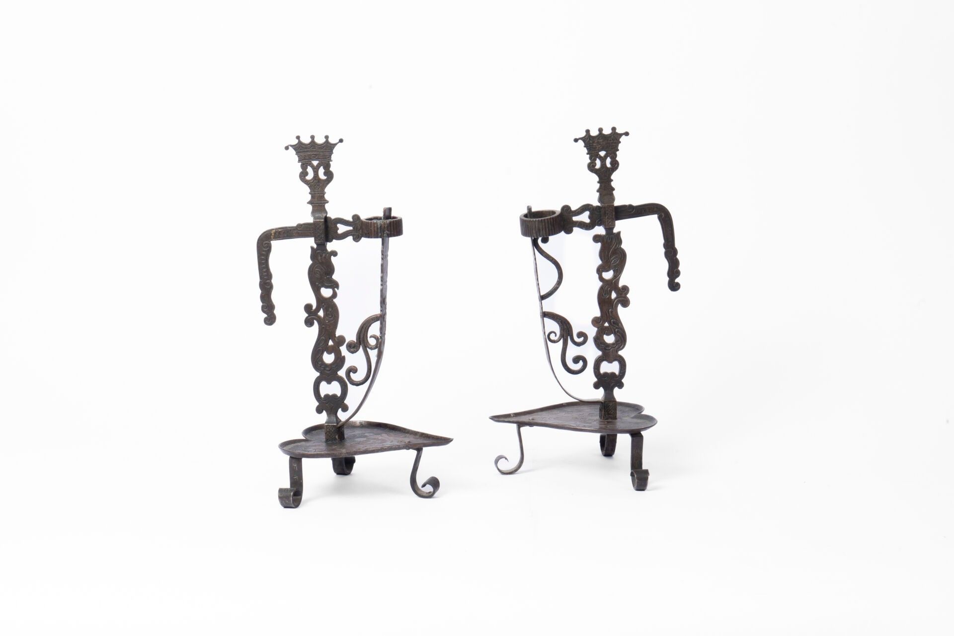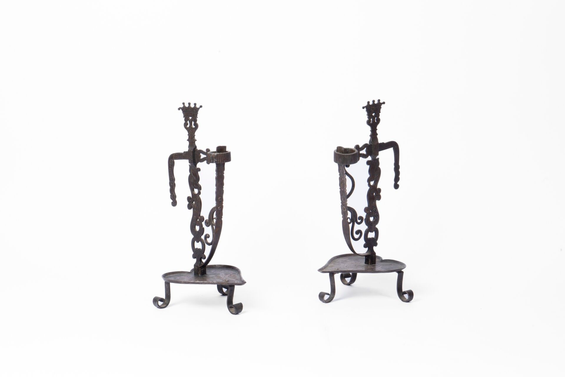 A pair of wrought-iron candlesticks on a heart-shaped base. Height 32 cm Wear and tear.