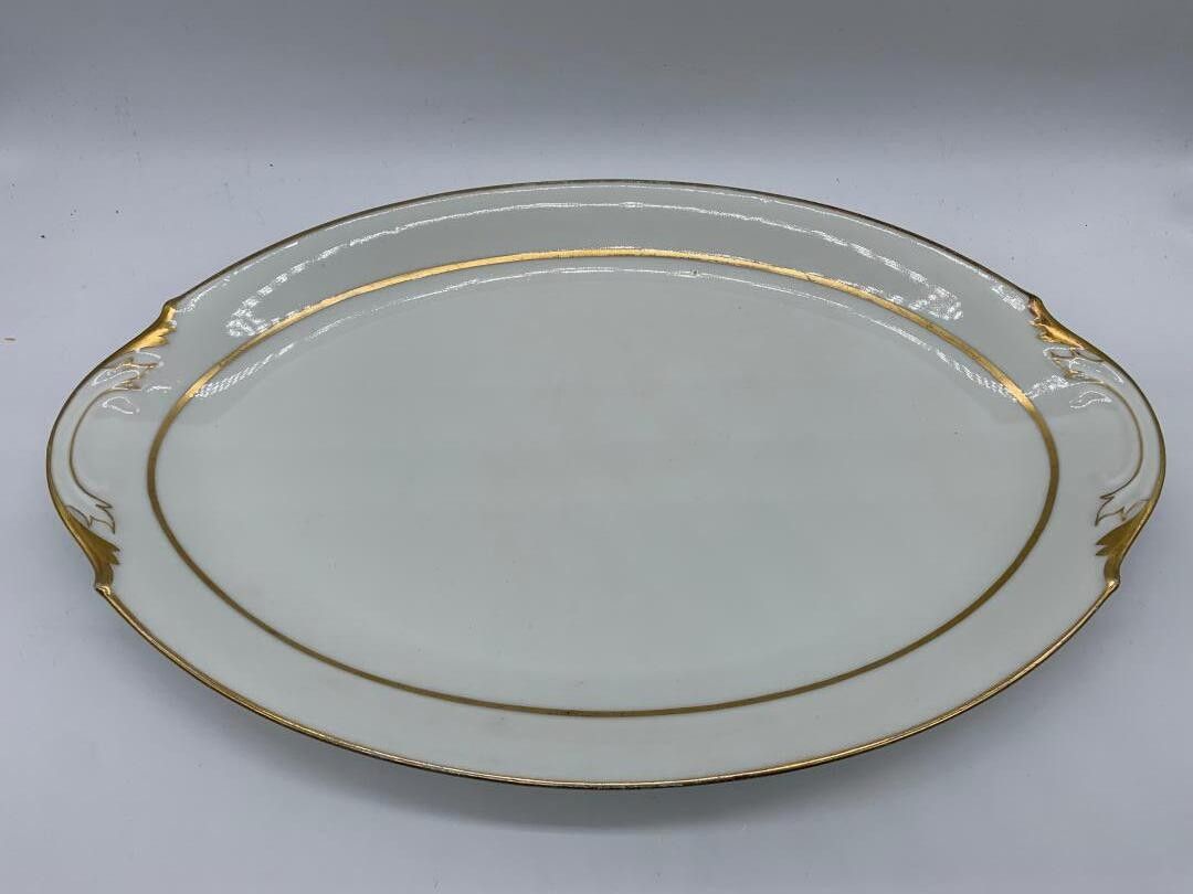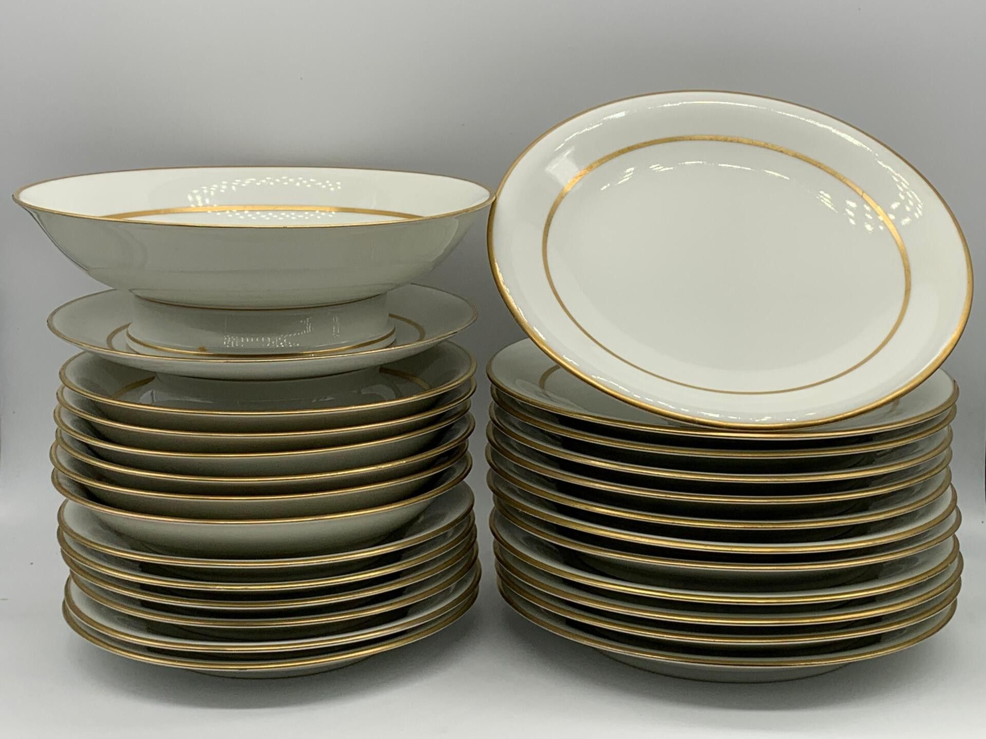 Serving set in white porcelain with gilt fillets comprising twelve large plates, six dessert plates, six soup plates, two pedestal serving dishes, a soup tureen, a salad bowl and a serving dish.
