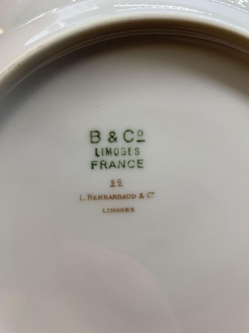 Eleven BERNARDAUD & Cie Limoges dessert plates with polychrome floral decoration on a blue, white and gilded border.