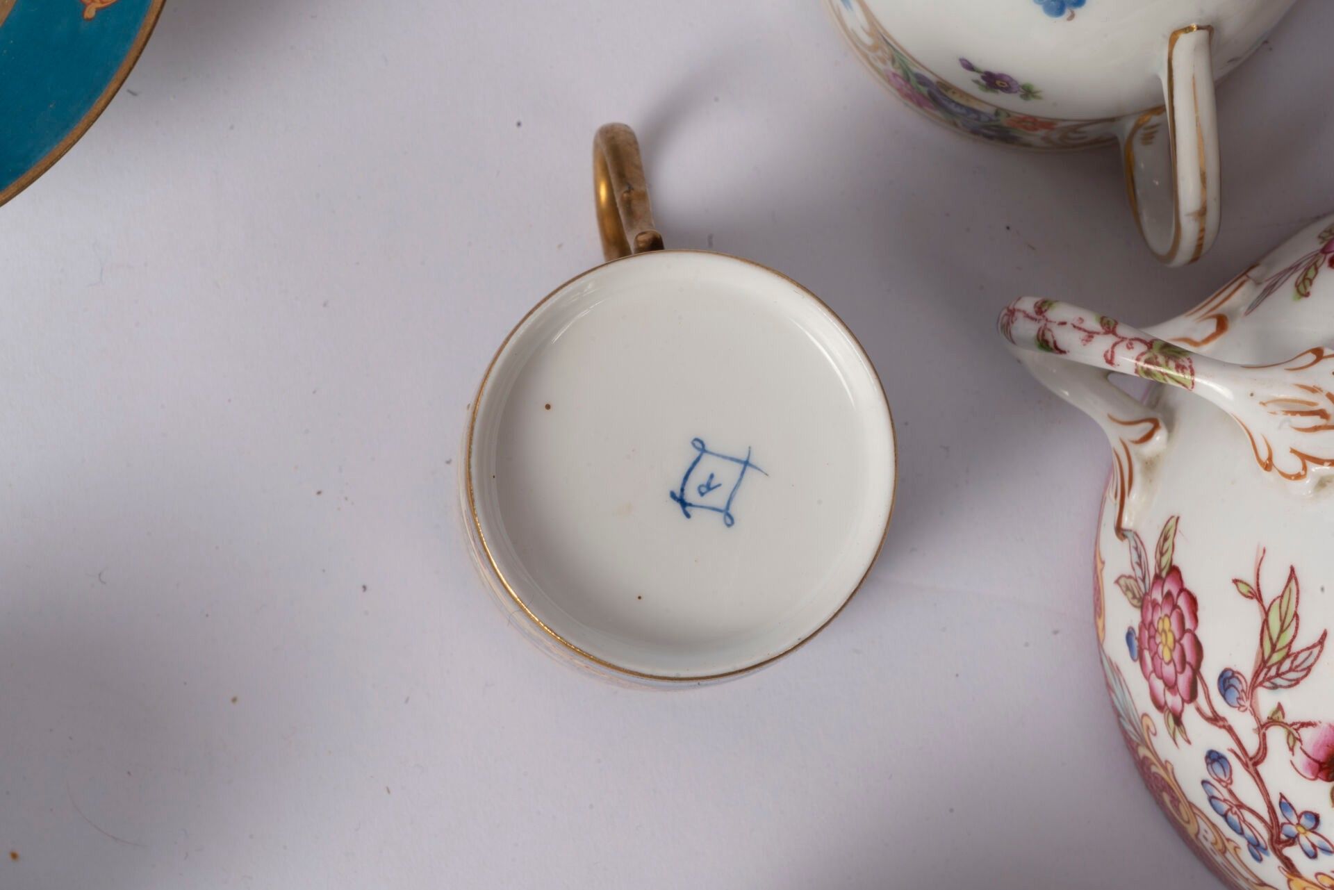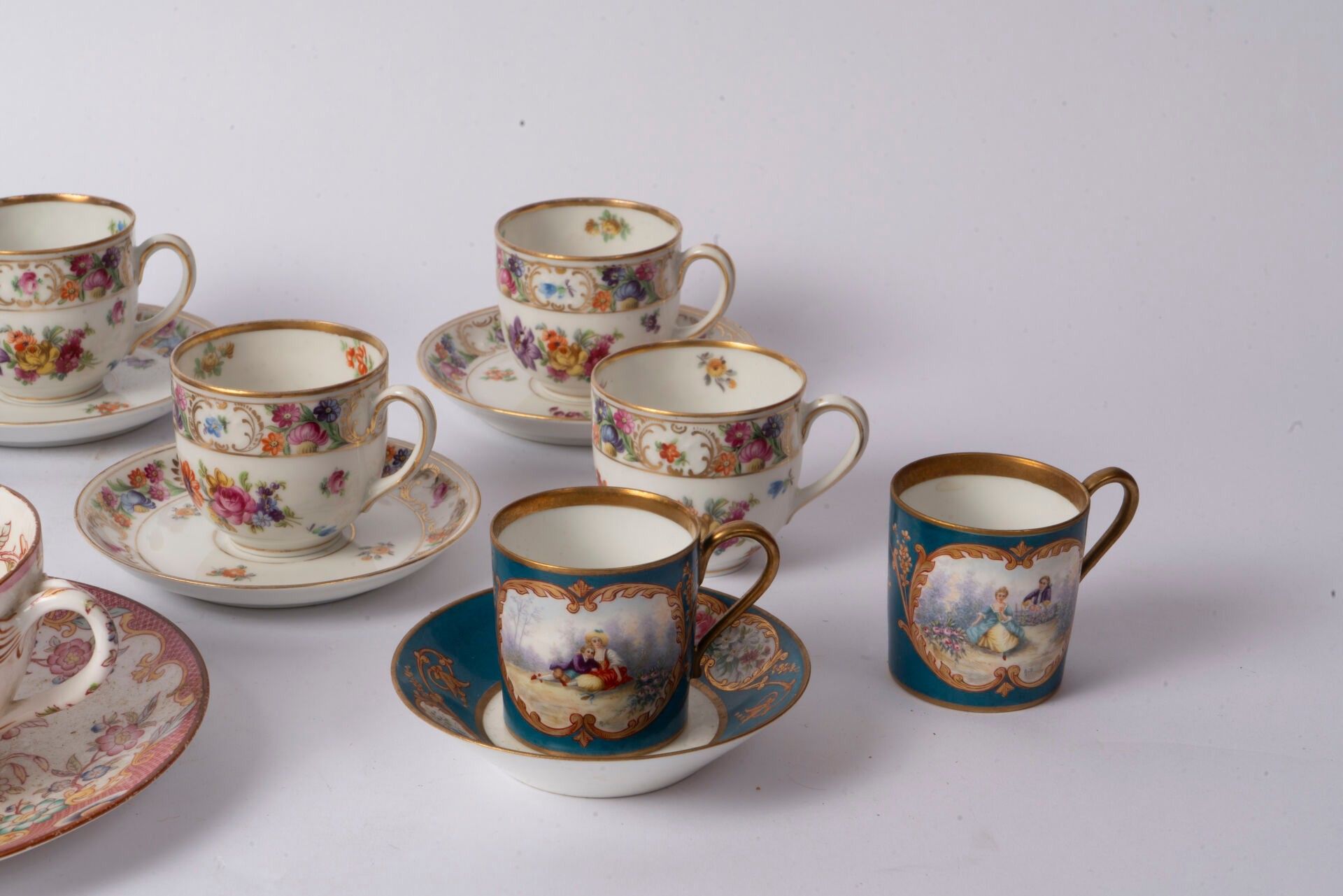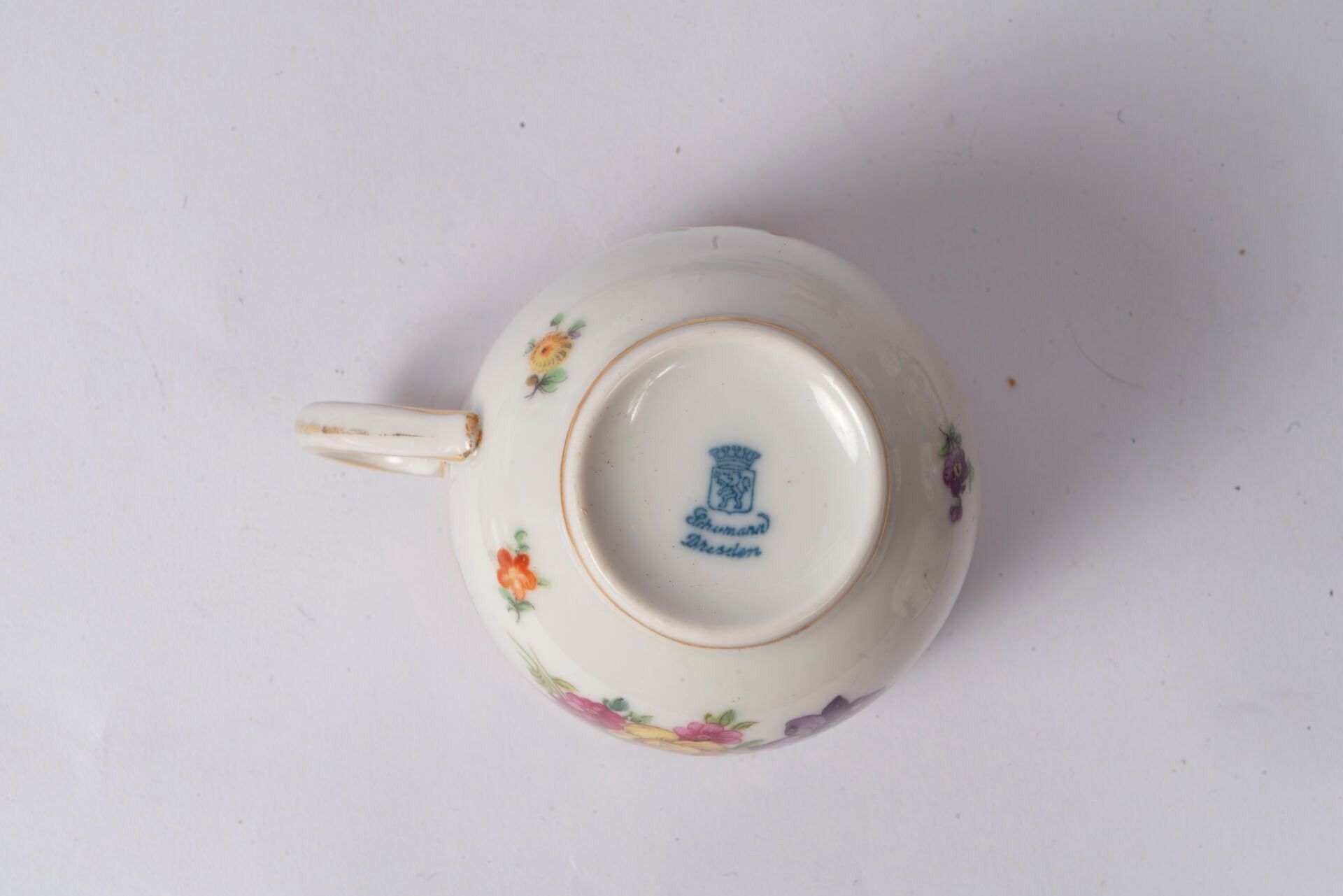 Two litron cups decorated with gallant scenes and a saucer. Crossed L mark, centred with an R.