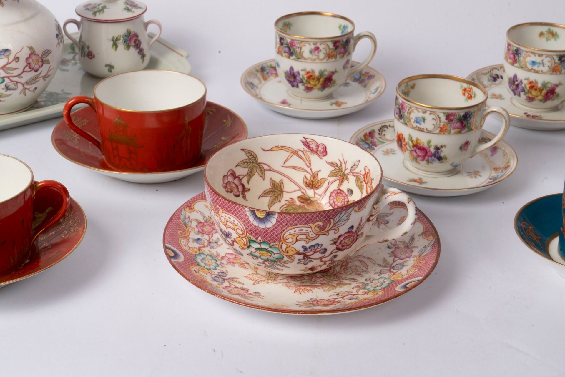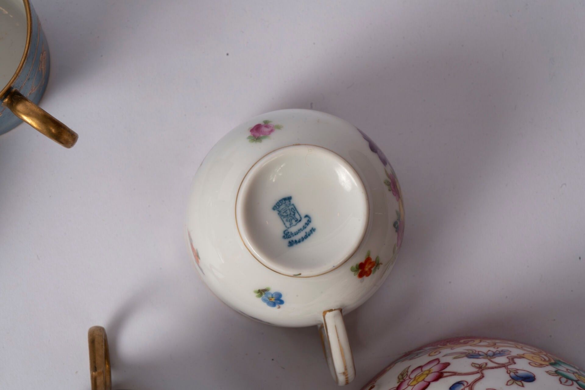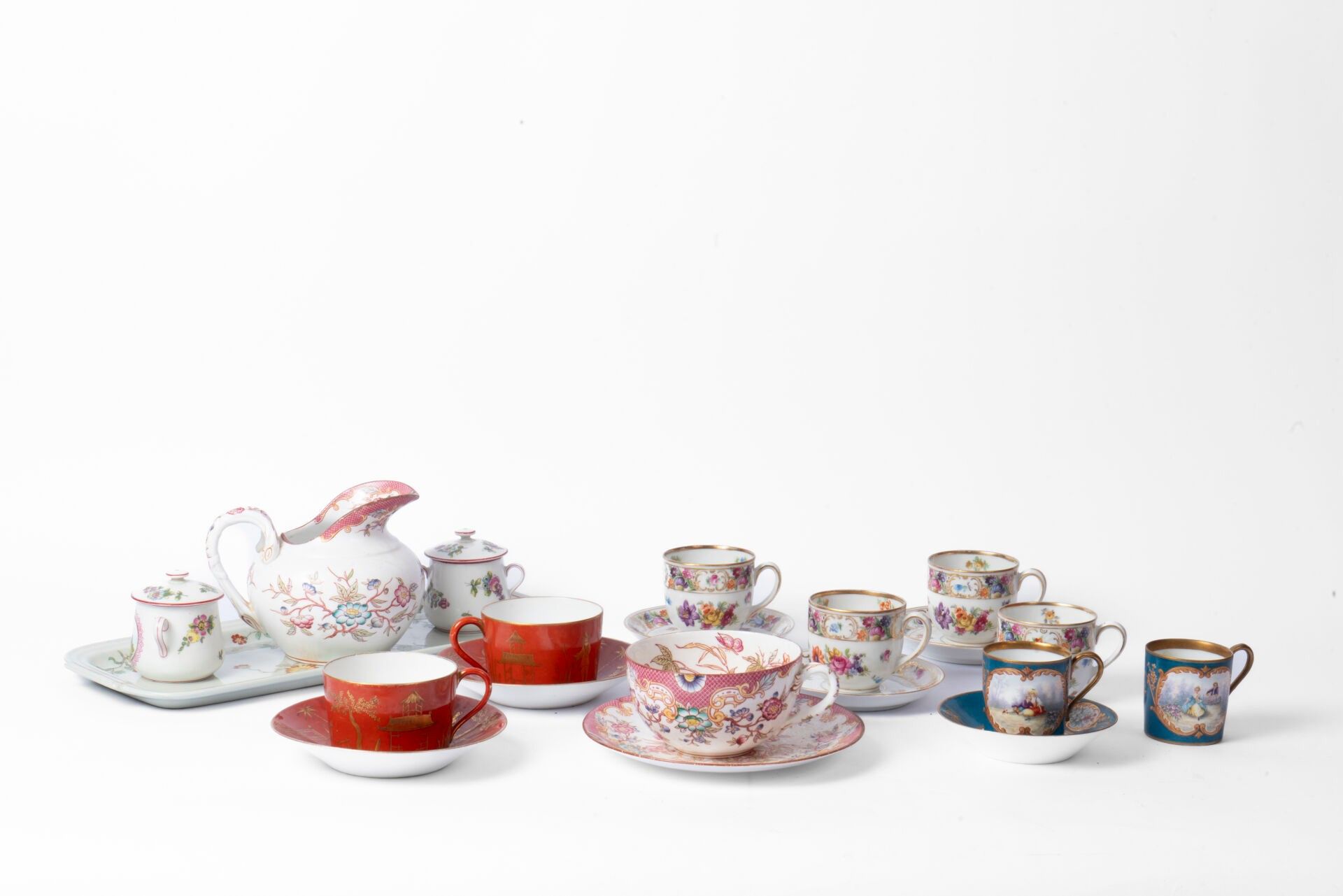 Two litron cups decorated with gallant scenes and a saucer. Crossed L mark, centred with an R.