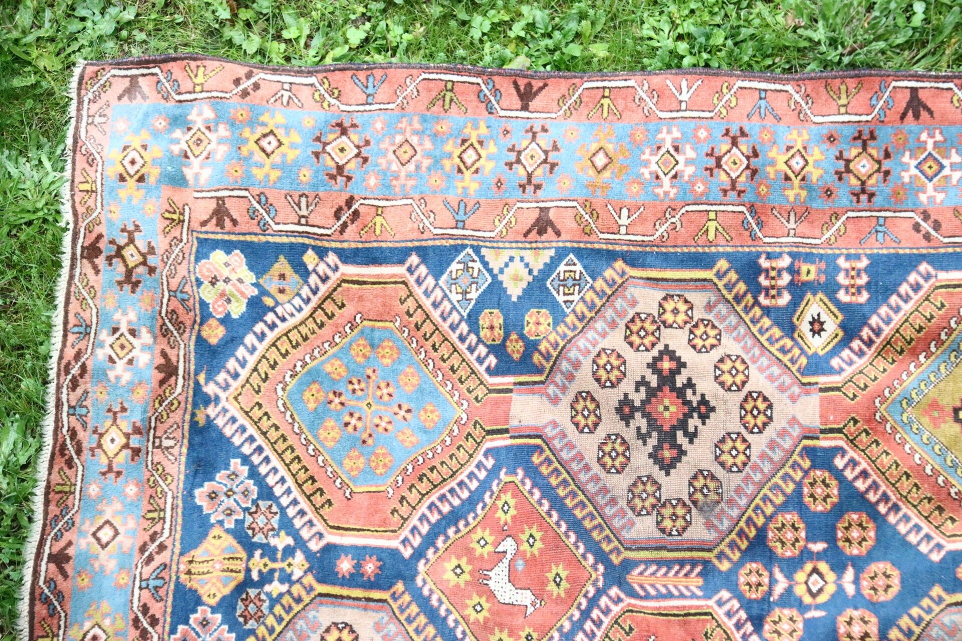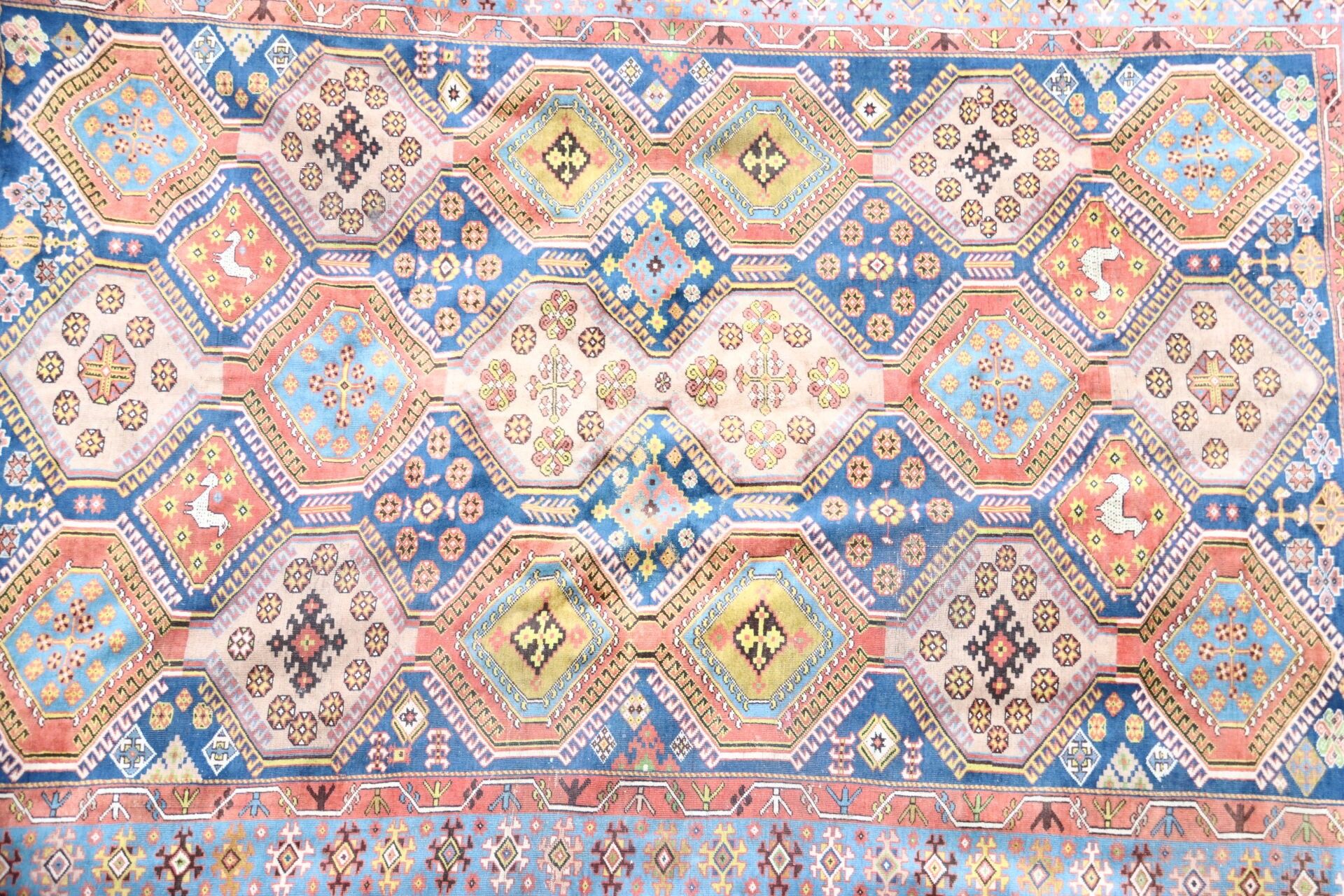 Wool carpet with geometric decoration on a blue field.