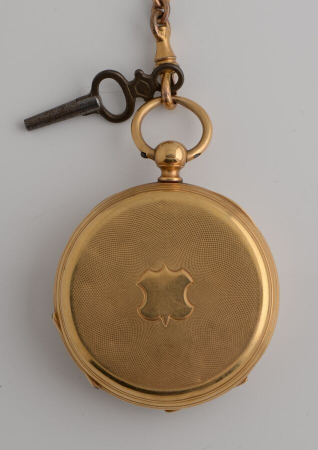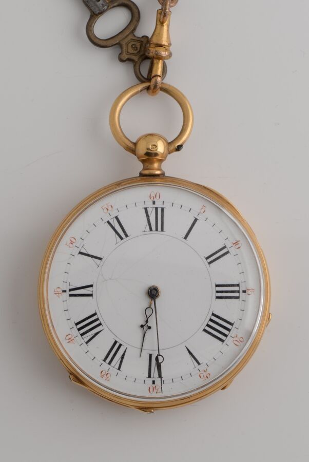 Pocket watch with yellow gold case and metal dust cover. Mechanical movement with cylinder escapement. White enamelled dial showing the hours in Roman numerals and the minutes in Arabic numerals.
