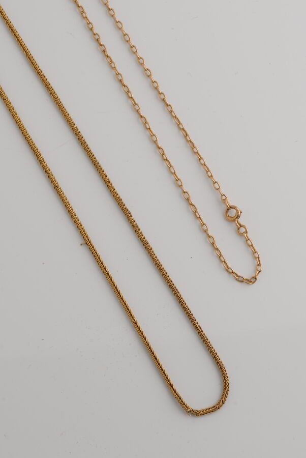 Set of two yellow gold chains, one a forçat chain, the other a plaited chain, the latter with an attractive engraved barrel clasp.