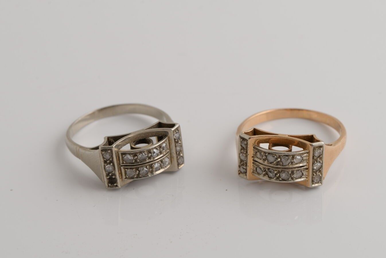 Two yellow and white gold rings set with small rose-cut diamonds.