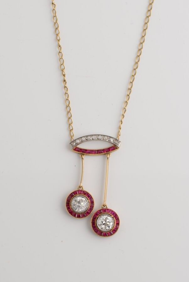 Yellow gold "négligé" necklace set with two diamonds in a setting of calibrated rubies, the upper motif set with diamonds and calibrated rubies. The main diamonds are old-cut and weigh approximately 0.59 and 0.53 ct. Circa 1920-1930 Gross weight 6.1 g - Length 40 cm