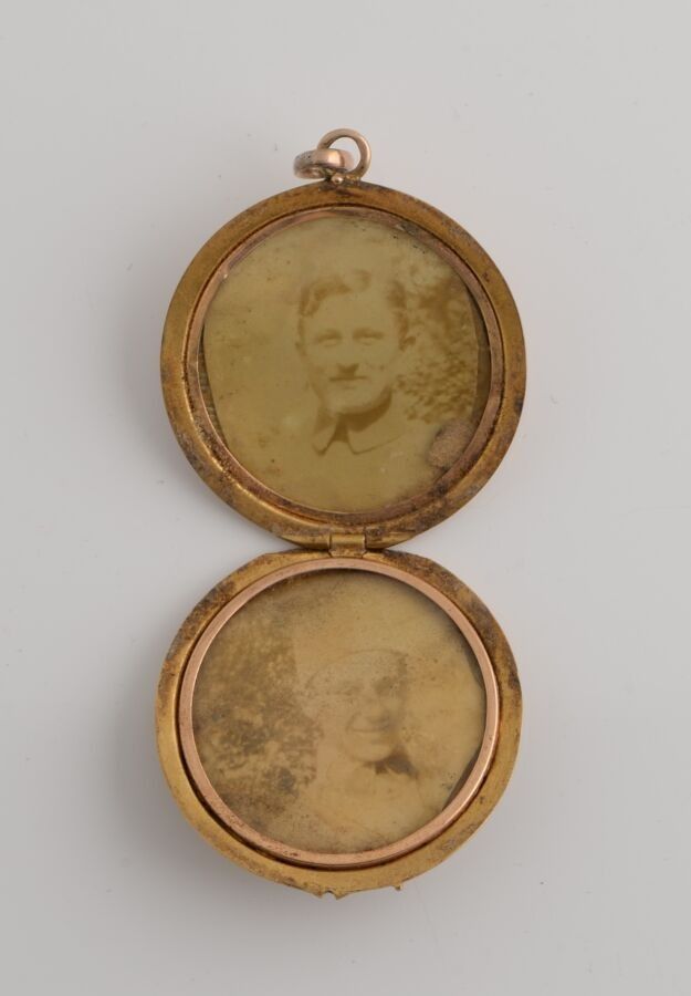Yellow gold photo pendant set with small button pearls and r…