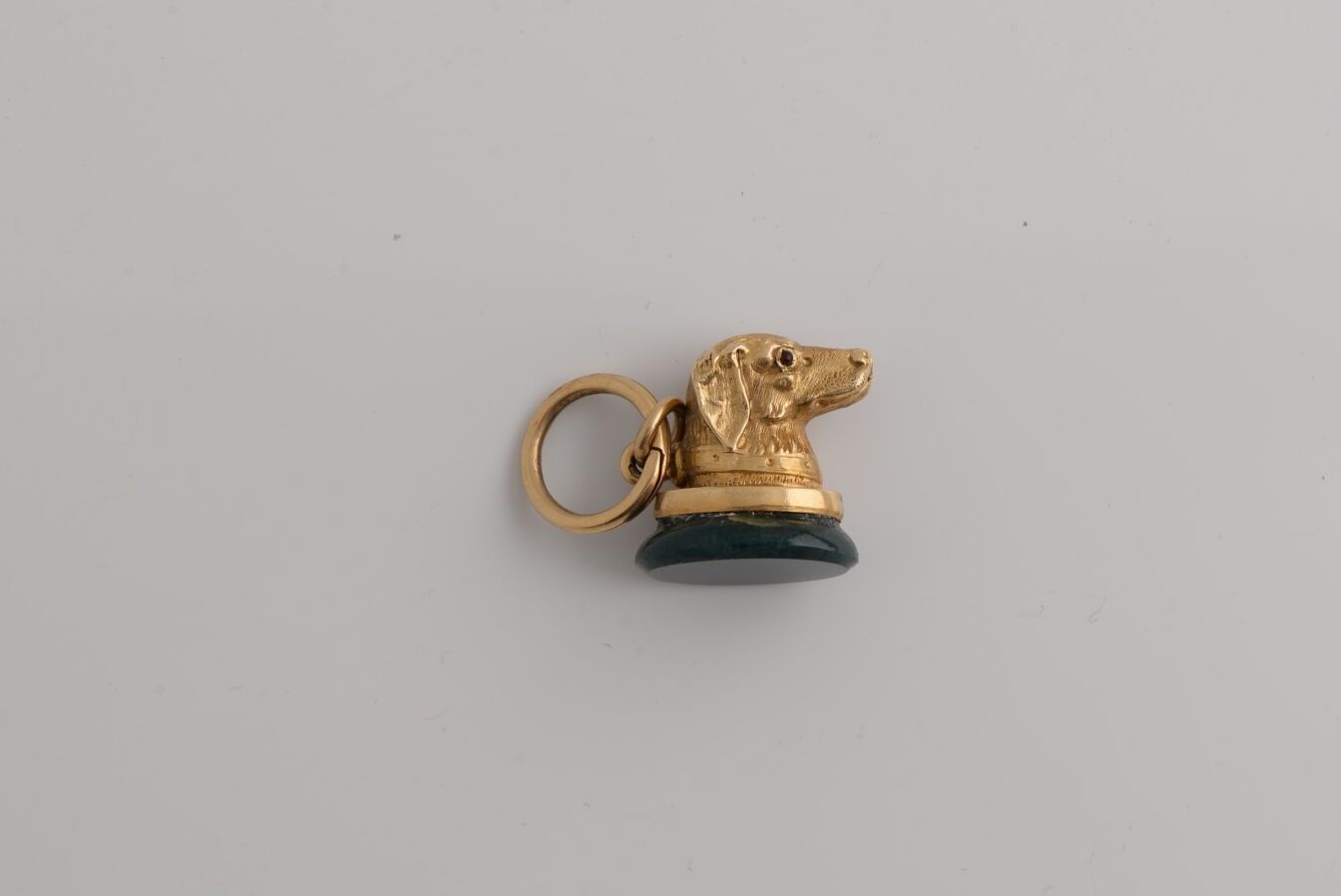 Yellow gold charm in the shape of a dog's head, the eyes set with ruby chips, the plate in blood jasper (virgin).