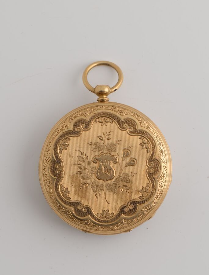 Pocket watch with yellow gold case and dust cover, the latter marked POLTI FRERES à TOURS, the back engine-turned and engraved with flowers framing an escutcheon. Mechanical cylinder movement. White enamelled dial showing the hours in Roman numerals and the minutes by a railway track.
