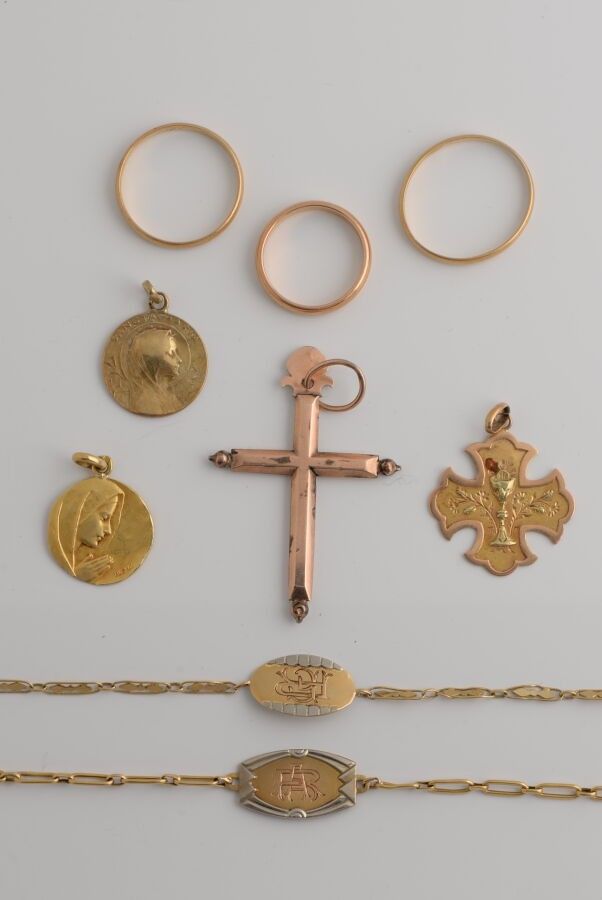 Gold lot comprising a 19th century regional cross, three religious medals, two bracelets with medals and three wedding rings.