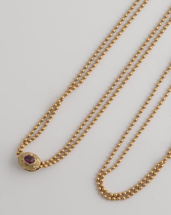 Yellow gold necklace with three rows of ball links, two joined by a mobile slide set with two amethysts.