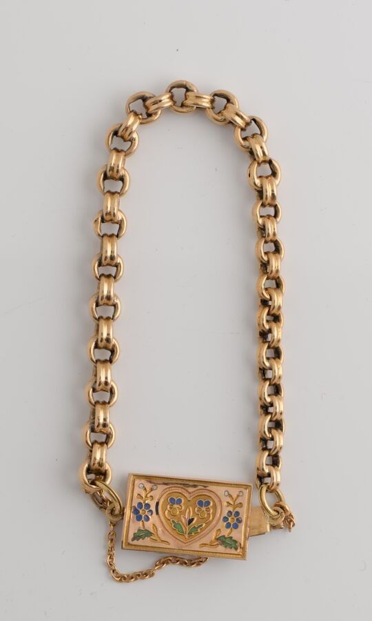 Sentimental bracelet in yellow gold with double jaseron mesh, the clasp with an enamelled plate of pansies.