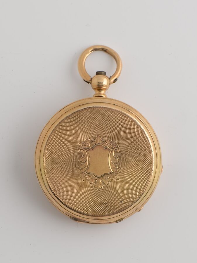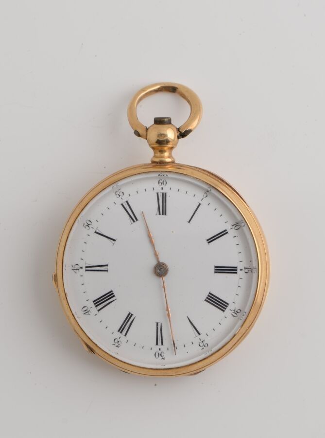 Pocket watch with yellow gold case, the metal dust cover engraved GAUTIER à TOURS, the back guilloché and engraved with an escutcheon. Mechanical cylinder movement. White enamelled dial showing the hours in Roman numerals and the minutes in Arabic numerals.