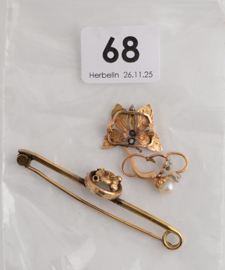 Lot of gold fragments comprising two earrings set with pearls or blue stones, a butterfly motif, and a brooch with metal setting and gold motif.