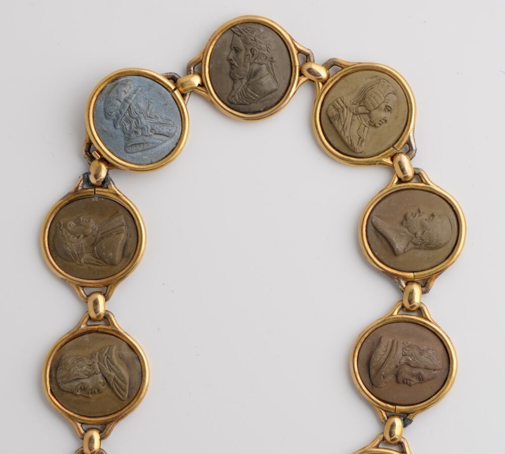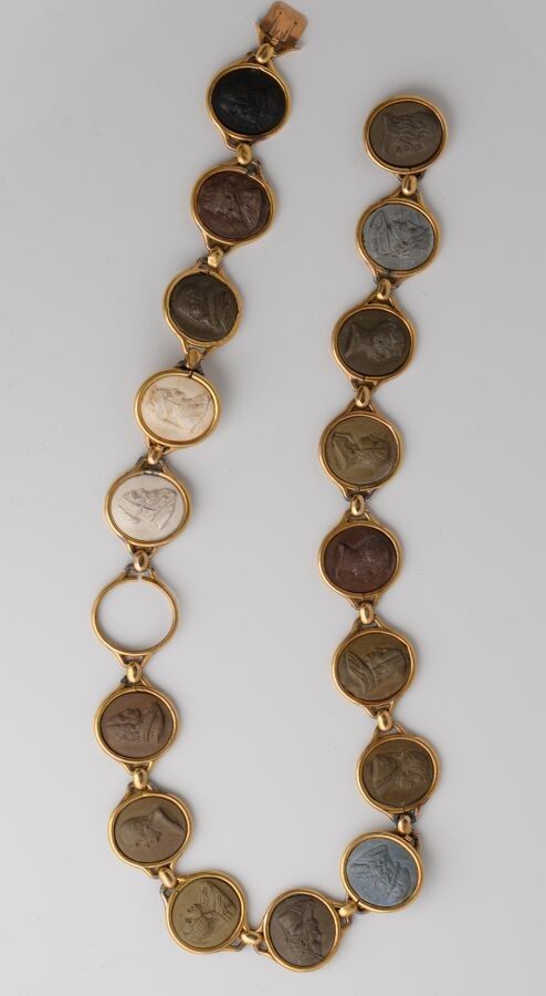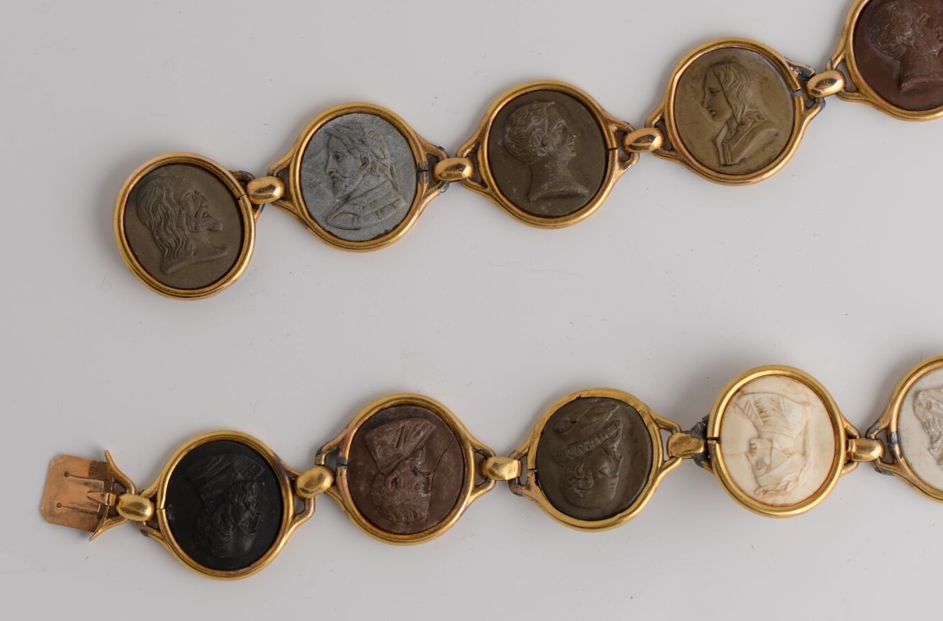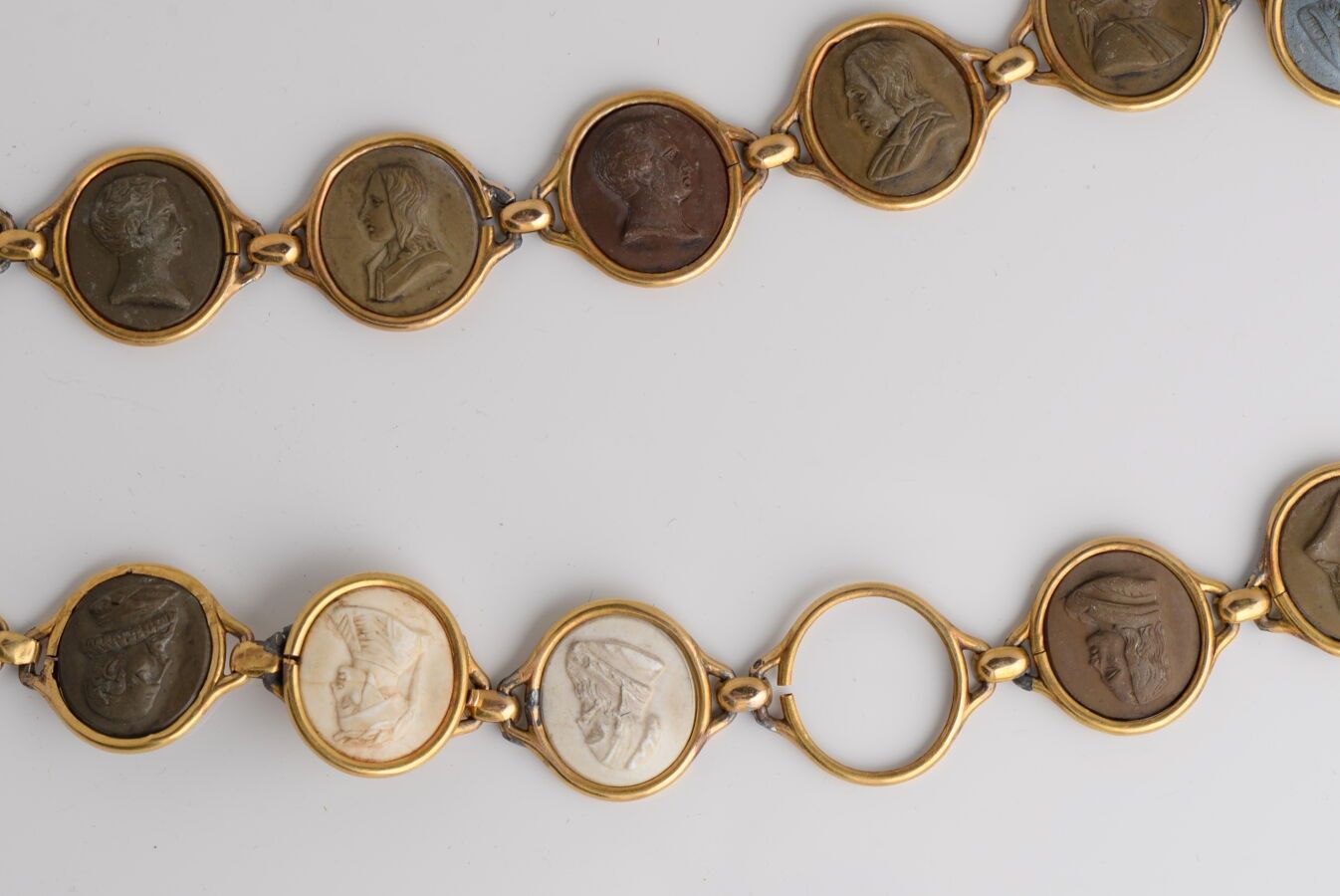 Yellow gold necklace with transformation, comprising eighteen carved lava stone medallions depicting philosophers, writers or notables in profile. The necklace splits to form two bracelets with seven medallions each.