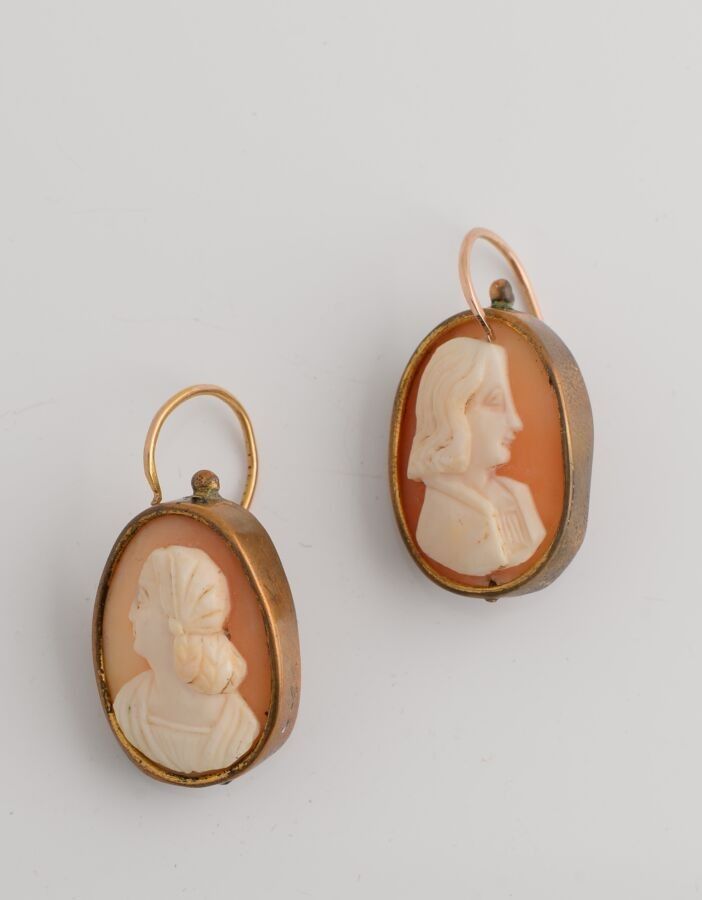 Pair of metal earrings, the mobile part of the clasp in yellow gold, set with a Neapolitan cameo on a shell decorated with female and male profiles.
