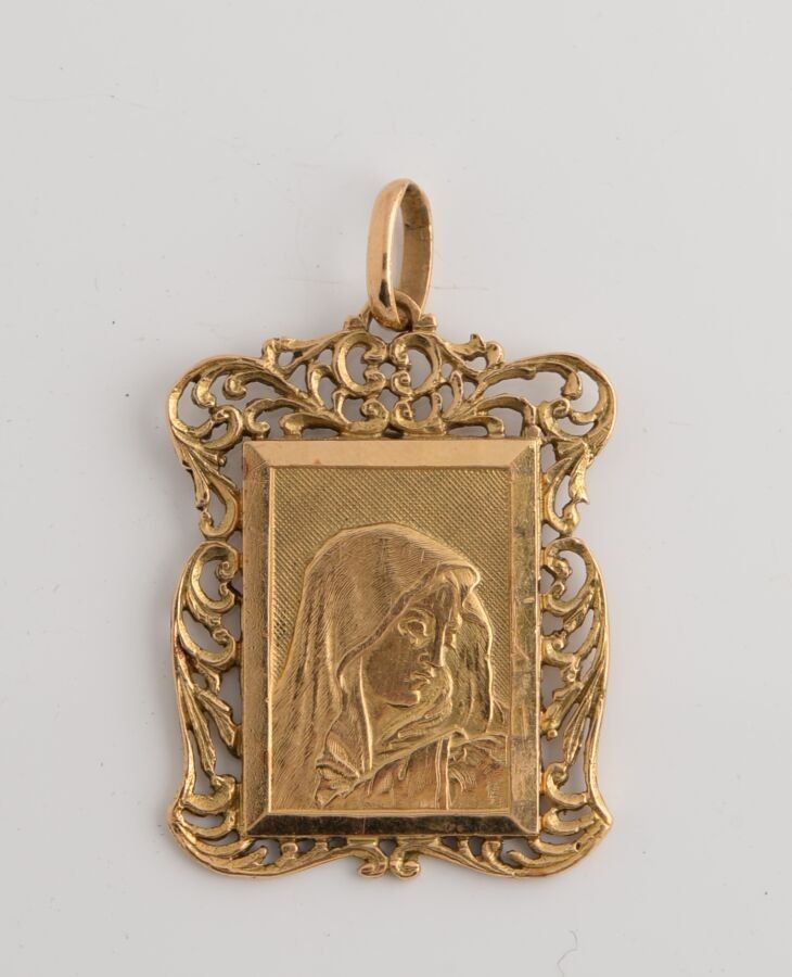 Rectangular yellow gold medal depicting the Virgin Mary in an openwork frame.