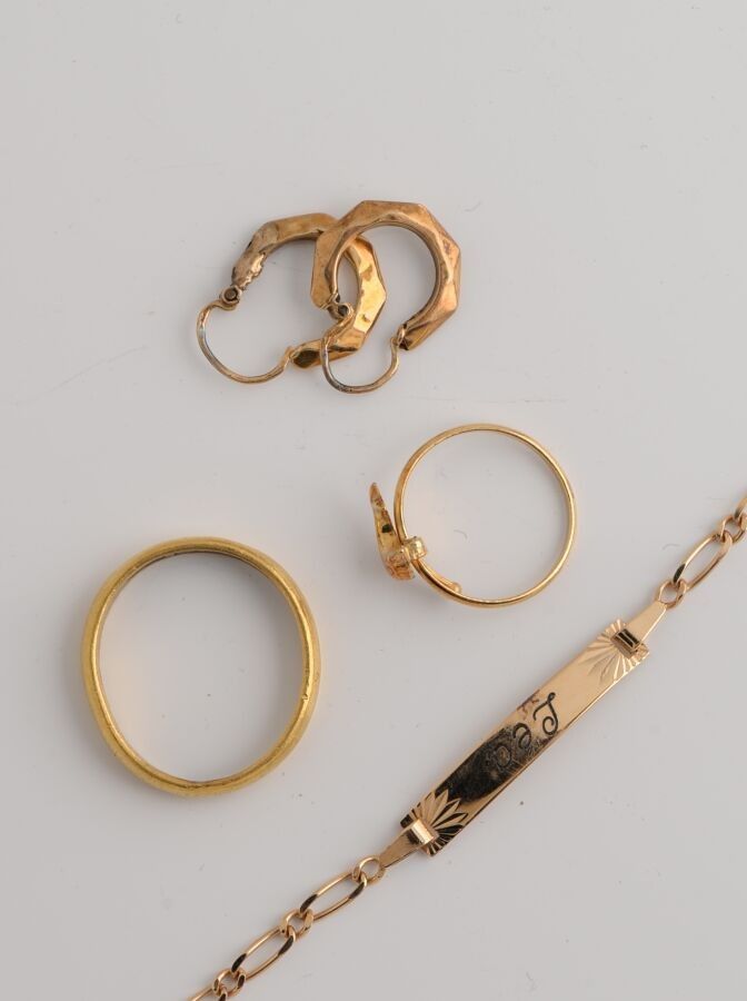 Lot of yellow gold jewellery comprising a wedding ring, a curb chain, a ring and a pair of earrings.