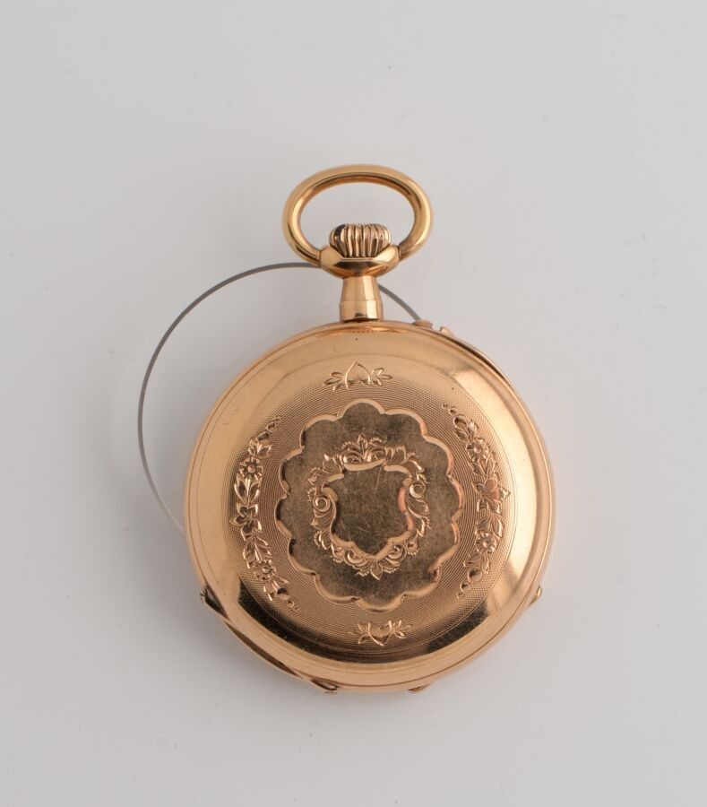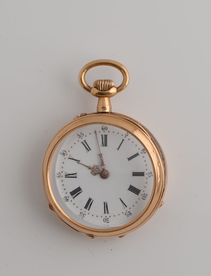 Collar watch with case and dust cover in yellow gold, the back engraved and guilloché. Mechanical movement. White enamelled dial showing the hours in Roman numerals.