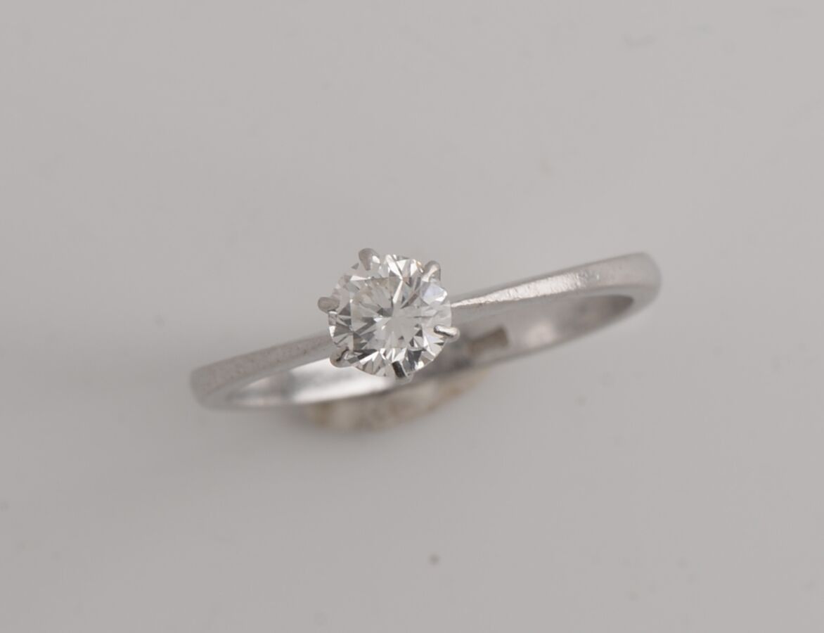 White gold ring set with a solitaire diamond weighing approximately 0.64 carat.