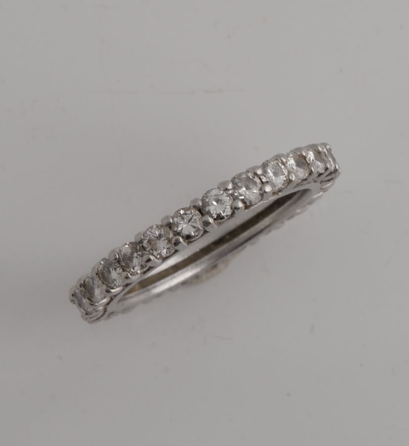 American wedding band in white gold set with approximately twenty-six small diamonds.