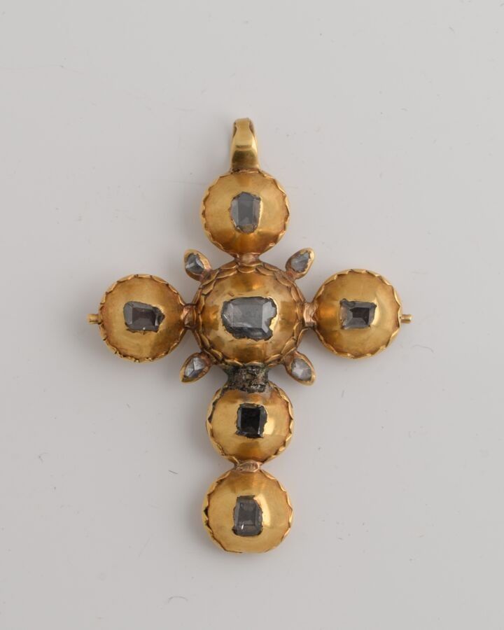 Regional cross plated with gold leaves and set with old baguette-cut diamonds.