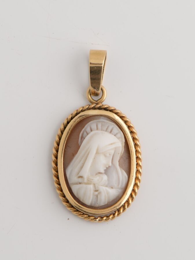 Yellow gold pendant set with a shell cameo depicting the profile of the Virgin Mary.