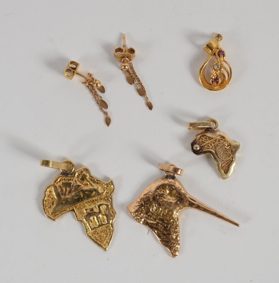Yellow gold lot comprising three pendants, a pair of earrings and a stone-set pendant.