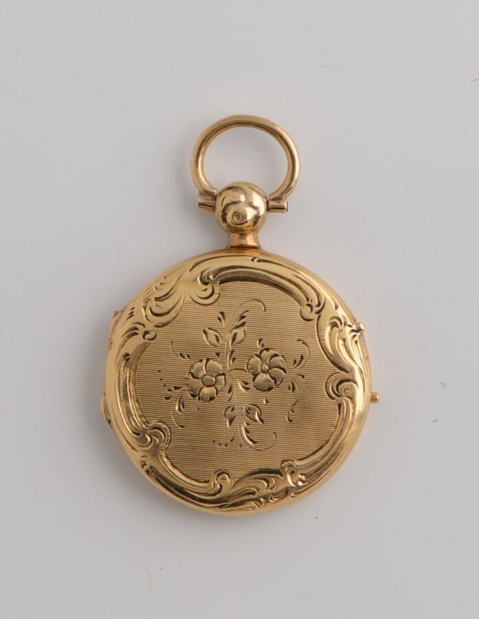 Yellow gold photo medallion engraved with flowers and ribs, …