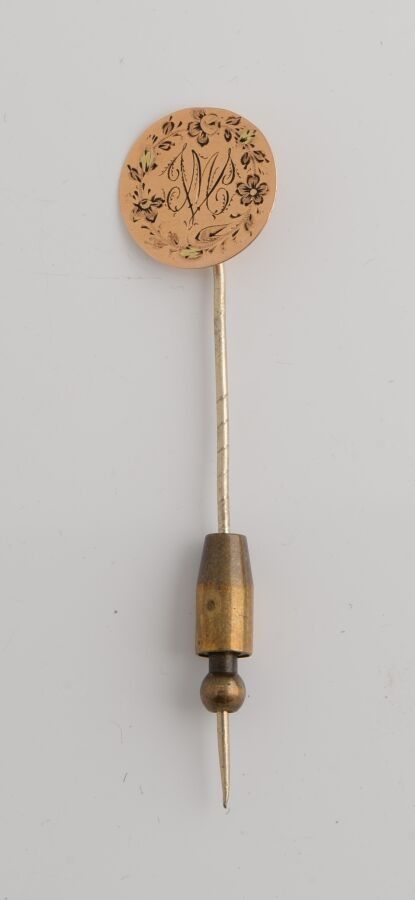 Two-tone gold pin engraved with a monogram, the pin and clasp in metal.
