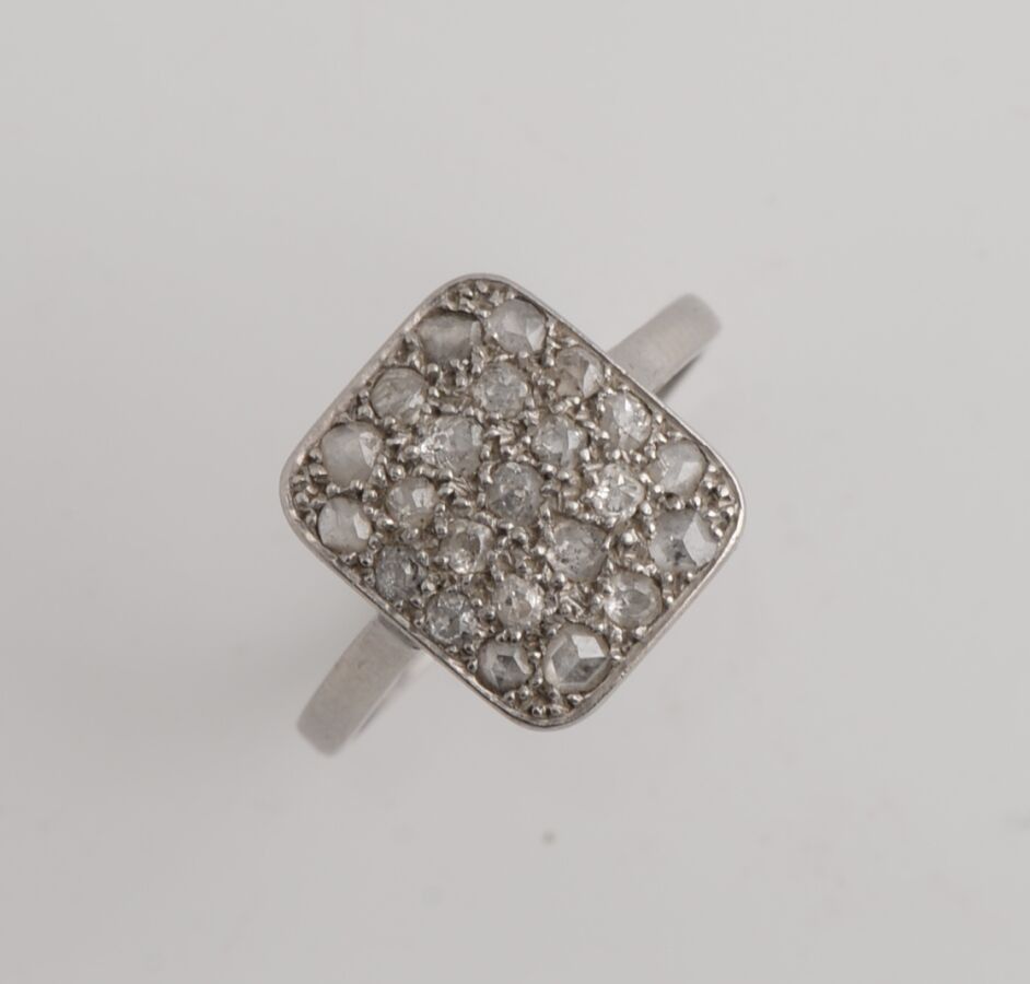 Ring in white gold, the rectangular bezel paved with small diamonds.