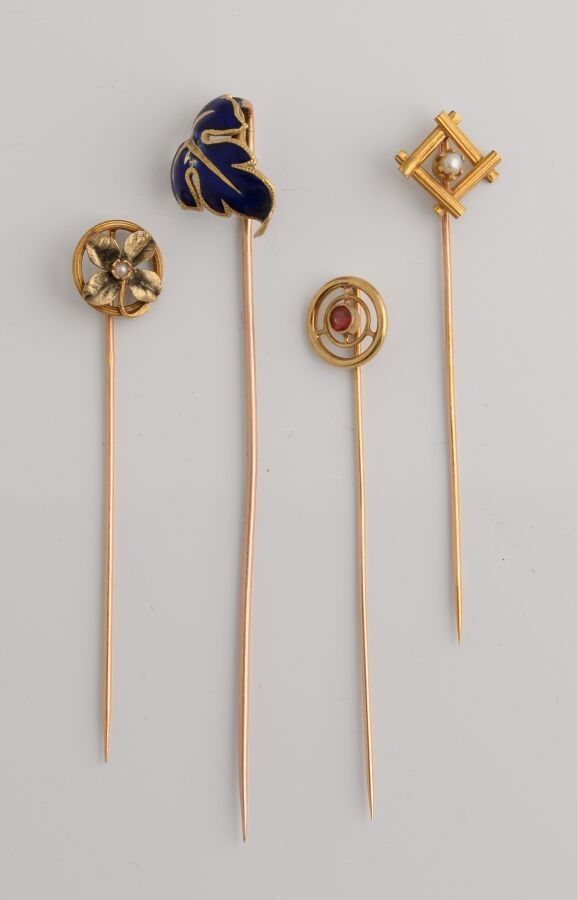 Set of four gold pins, one with a floral motif centred on a cultured button pearl, another with an alloy pin with a leaf motif in blue-enamelled yellow gold, a yellow gold pin centred on a button pearl, and a pin centred on a red imitation stone.