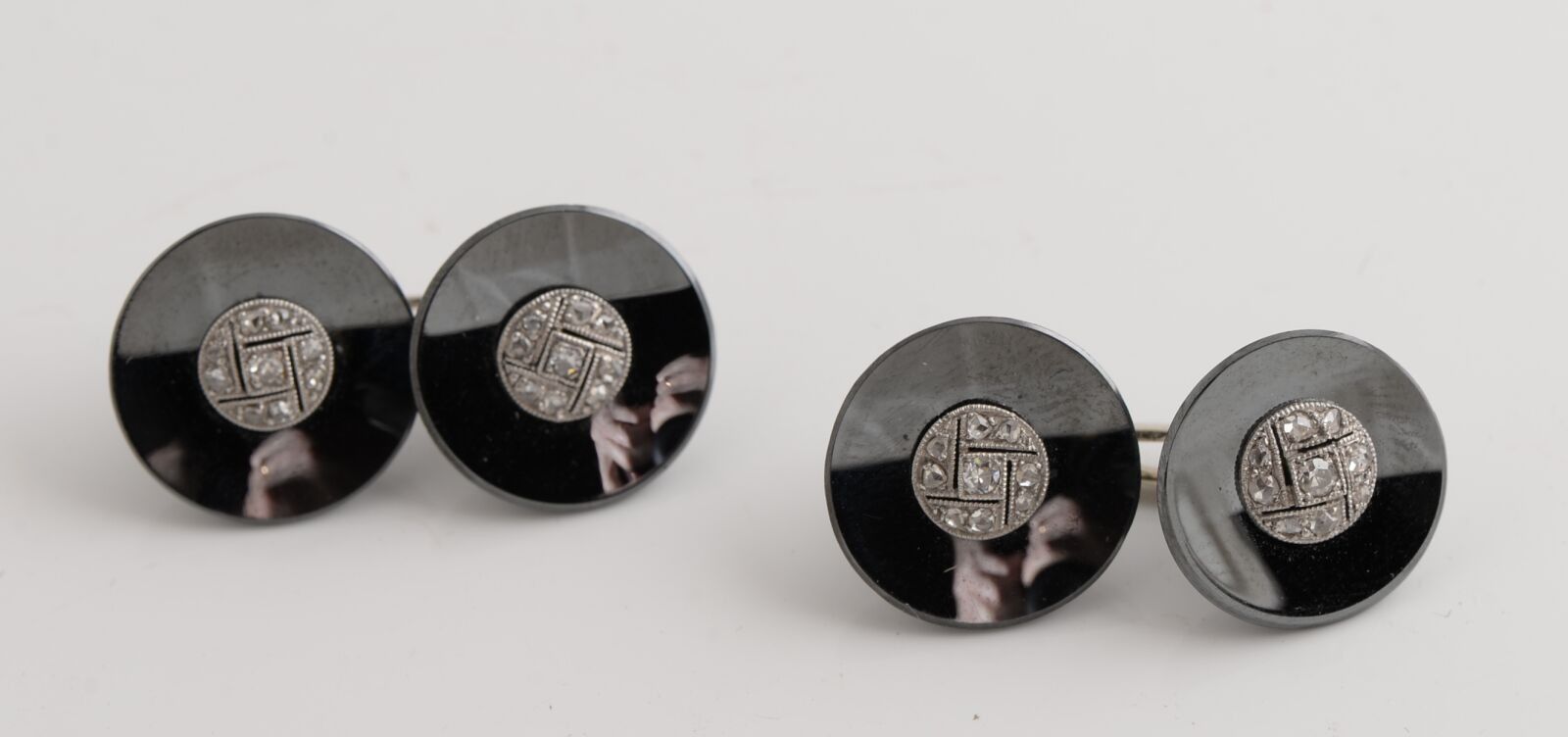 Pair of cufflinks in white gold and diamonds, the discs in an unidentified material.