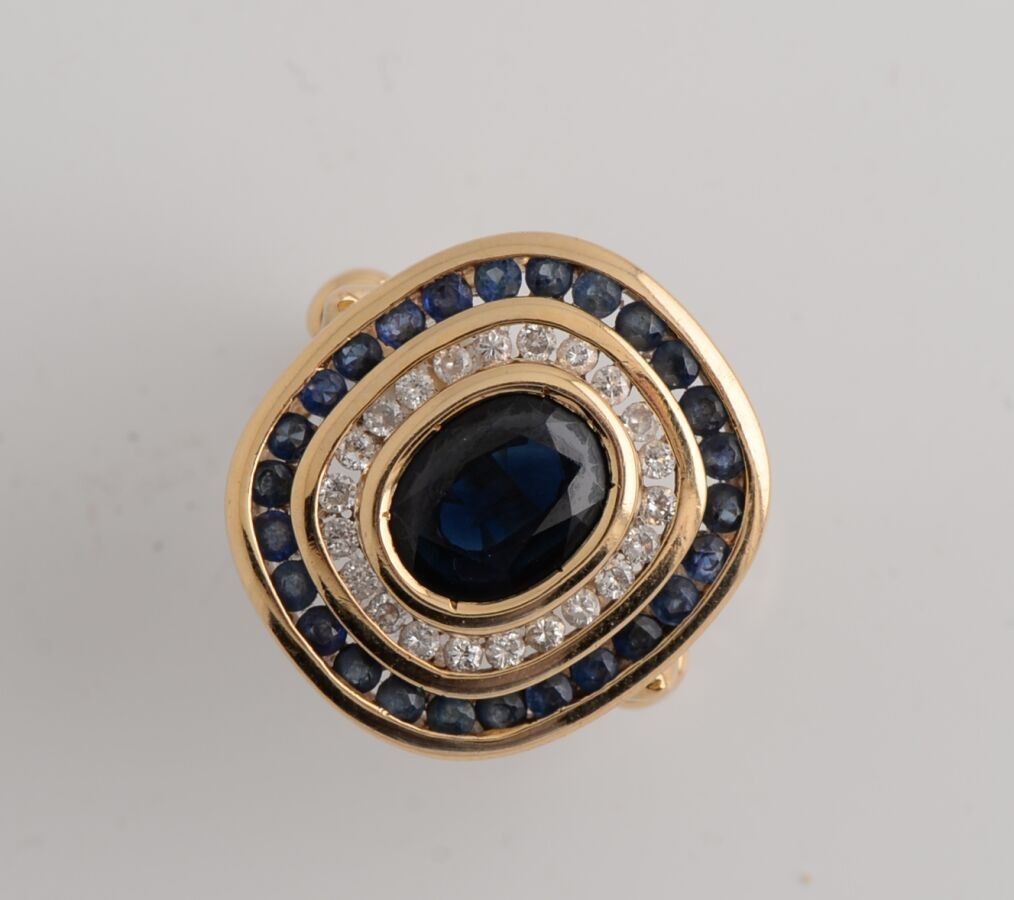 Yellow gold ring centred on a sapphire in a double setting of sapphires and diamonds.