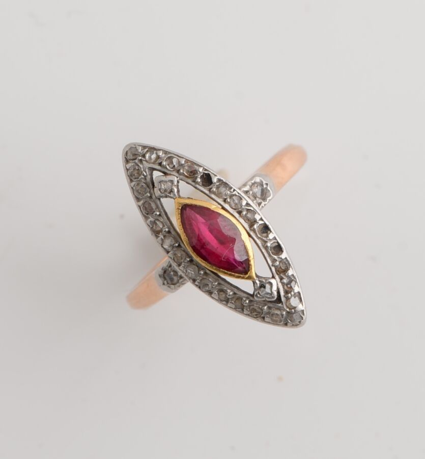 Yellow and white gold marquise ring set with a ruby surrounded by small diamonds.